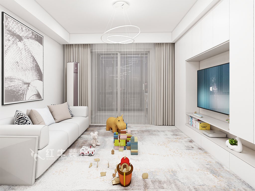 客戶希望家里溫馨簡約,儲物空間多一些,客餐廳過道區(qū)域偏大,利用率低,拆掉小房間和客廳之前墻體,過道留1.1米后做雙面柜增加儲物空間的同時,巧妙地把雙開門冰箱嵌入,這樣廚房的臺面增多,提高生活幸福感??筒蛷d整體計為暖色現(xiàn)代簡約,去客廳化設計,變成多功能廳,親子、游戲、觀影一體。材質(zhì)上運用,沙發(fā)選用了深一點的焦糖色布藝沙發(fā),地面為米色的啞光地磚,家的溫馨幸福裝滿屋。