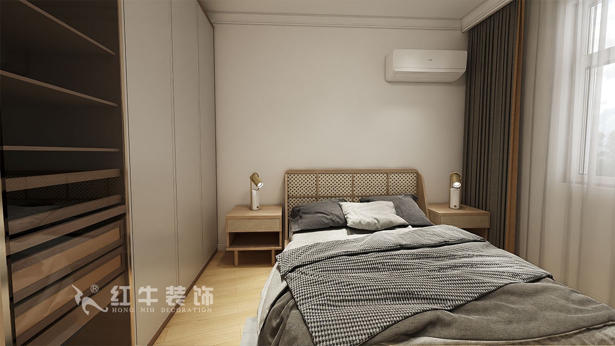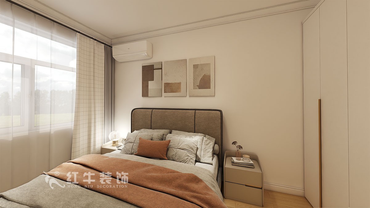 主臥室的更加簡(jiǎn)單,無吊頂設(shè)計(jì)使空間更加不壓抑,木色大床更適合老人的居住需求和觀感,整個(gè)空間色調(diào)柔柔的,很適合臥室的氛圍感。