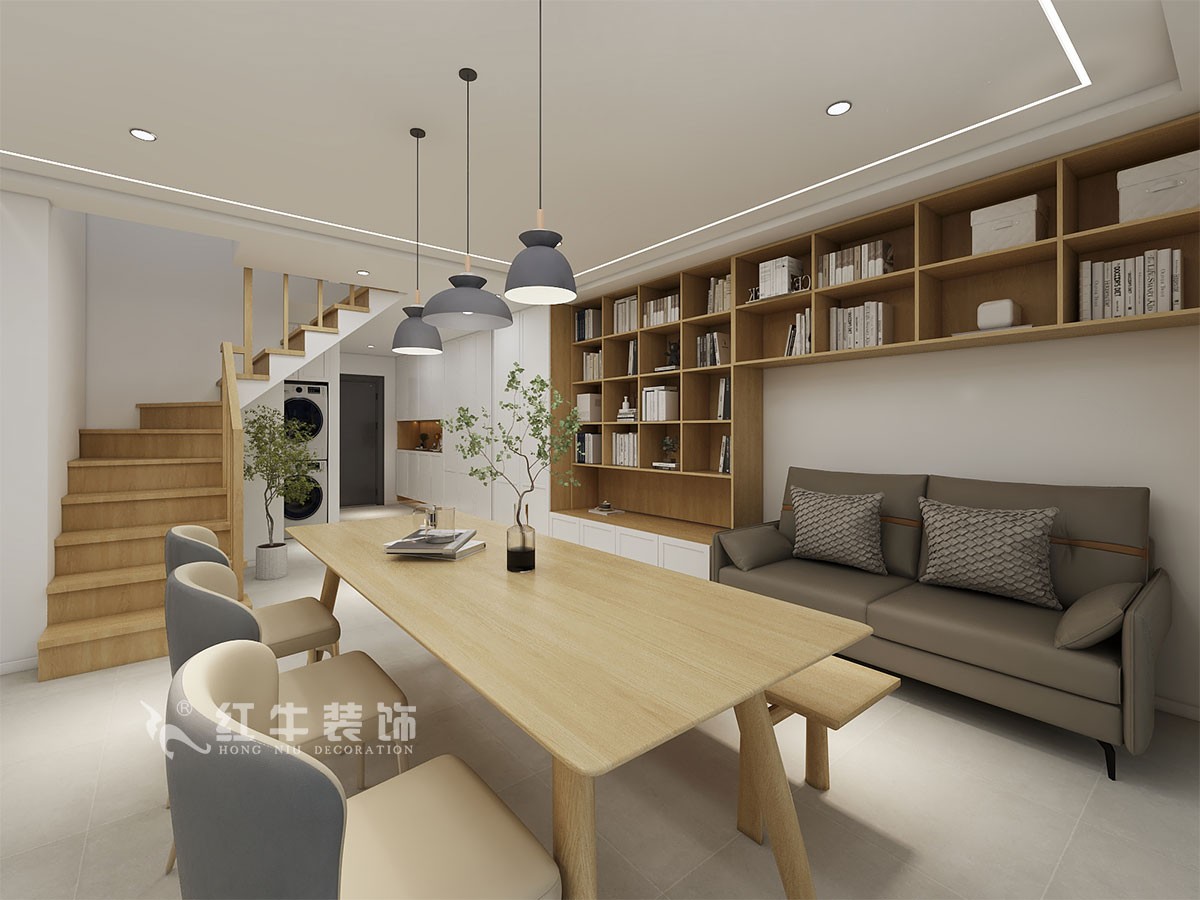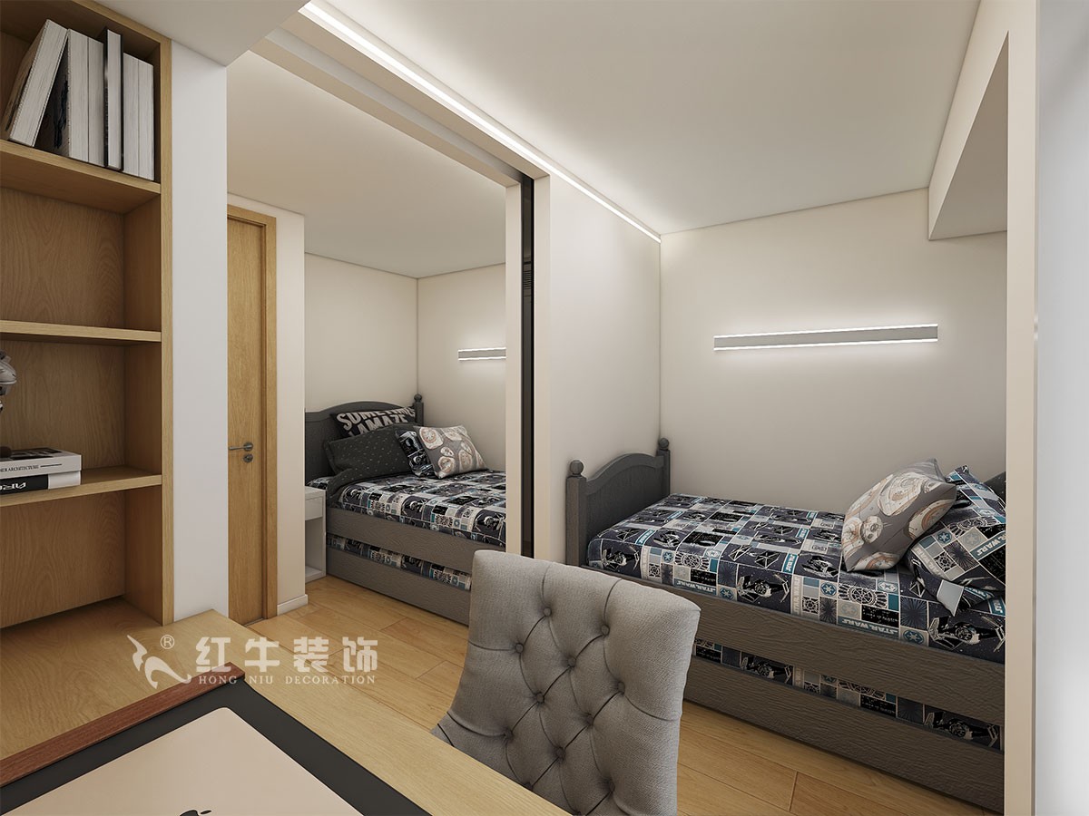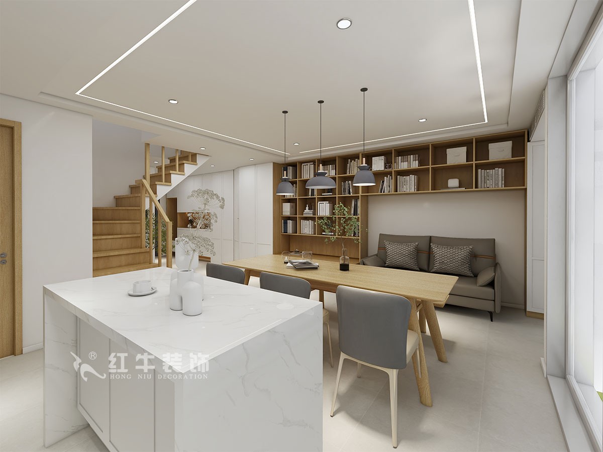 買的學區(qū)房,兩個小孩,一男一女,二樓有窗子的采光只能隔出來兩個臥室,這樣就把兒童房做了一個套間,做了口袋門,晚上睡覺保證兩個臥室的私密性。一樓做成整體空間,餐桌不單單是用餐的桌子,還可以解決孩子做作業(yè),喝茶等問題。