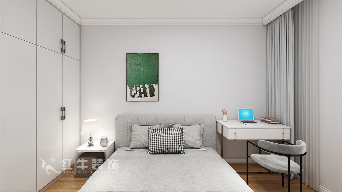 臥室無吊頂,石膏線條設計,使空間更加不壓抑。白灰色的大床和奶茶色的柜子相得益彰,更適合兩人的居住需求和觀感。整個空間色調溫和,很適合臥室的氛圍感。