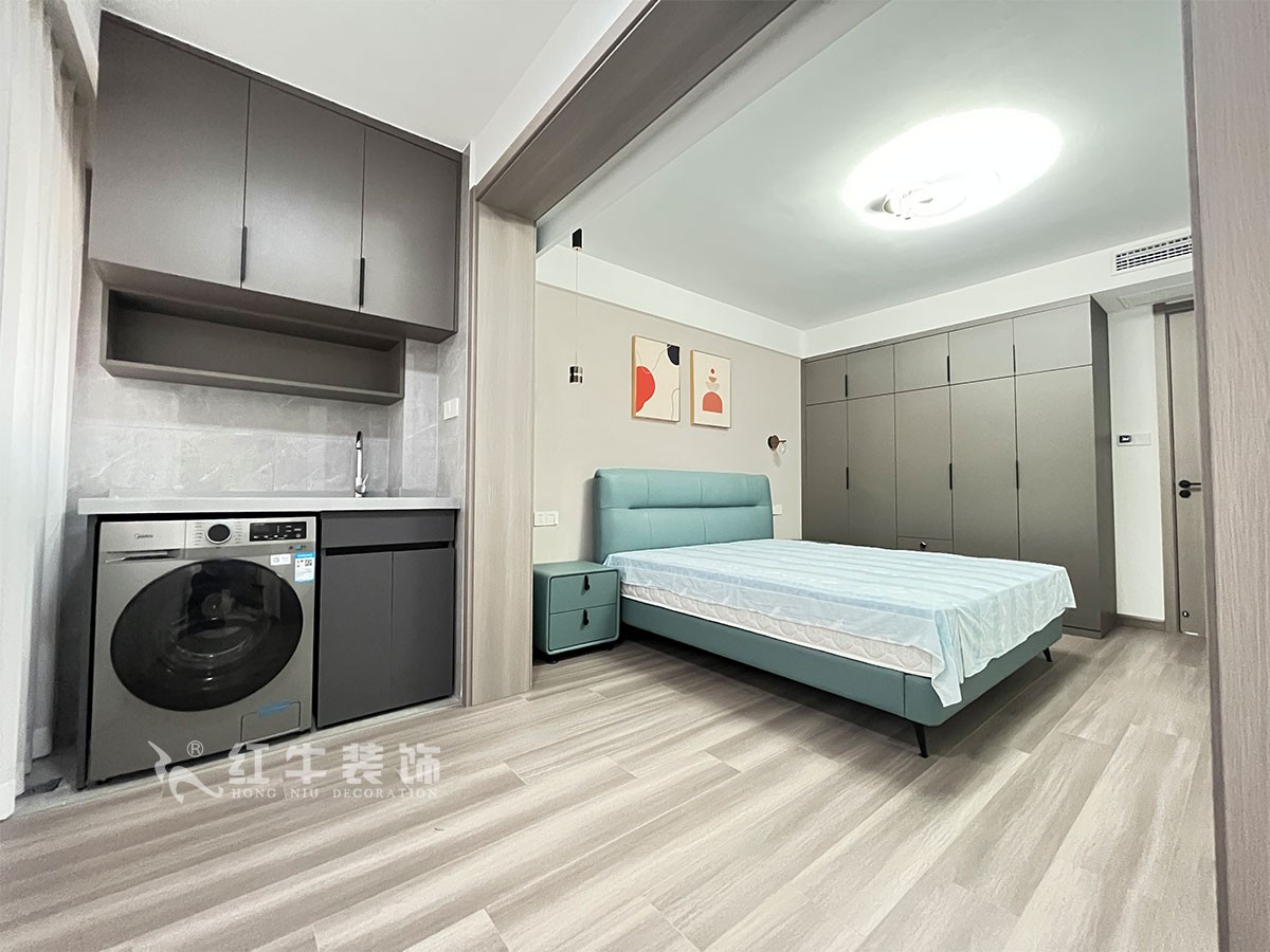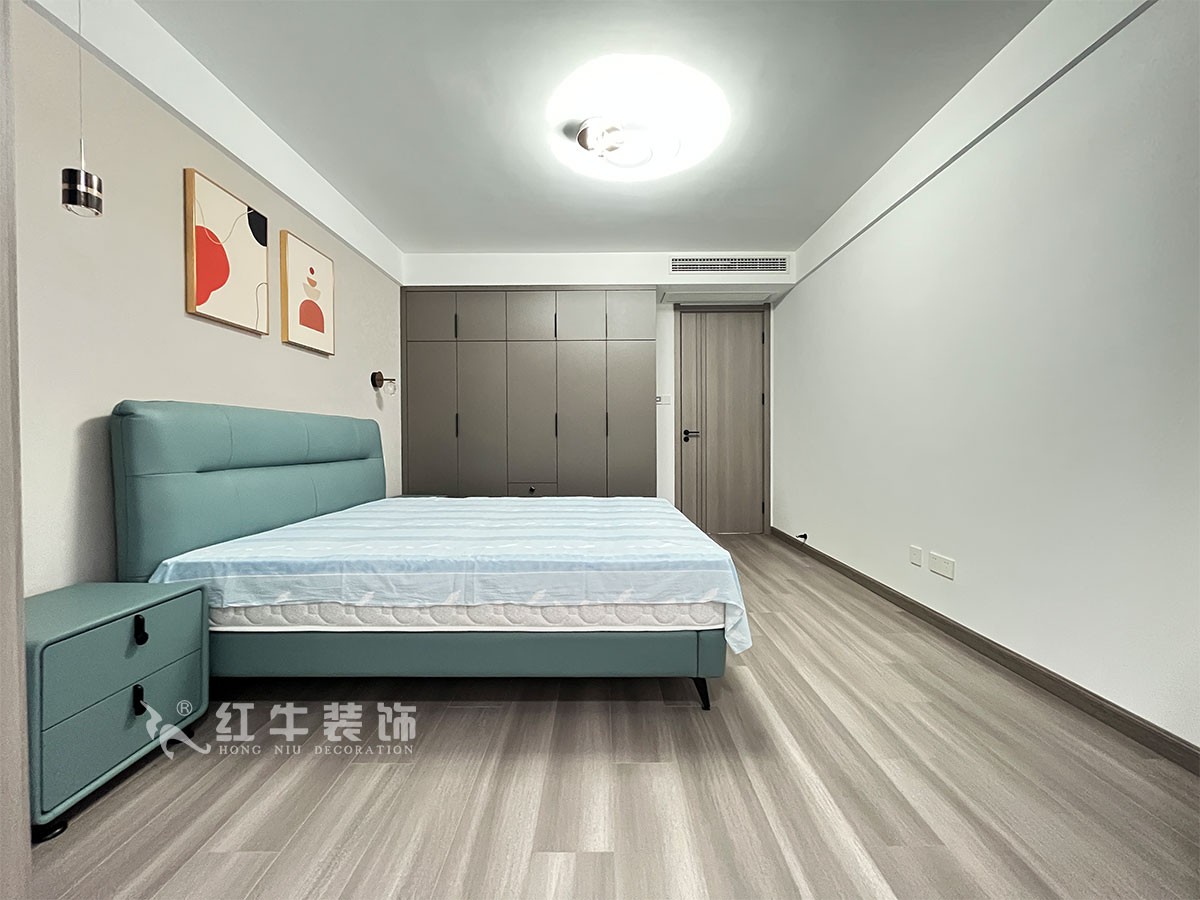 此案主要是養(yǎng)老居住,在舒適度上要求比較高,臥室是整套房子中最私人也是最體現(xiàn)出溫馨休閑感的空間,在設(shè)計(jì)時(shí)體現(xiàn)出靜謐舒適的感覺,并且與其他空間明顯的區(qū)別,利用書房厚度開洞口,把電視掛墻上,把冰箱嵌入,更好的布局。這樣舒適度更好,區(qū)域劃分明顯,動(dòng)靜分離。吊頂簡(jiǎn)潔大氣,配以輕現(xiàn)代家具,完美闡釋了簡(jiǎn)約風(fēng)格。整體現(xiàn)代簡(jiǎn)約風(fēng)格的設(shè)計(jì),搭配上顯眼的綠色植物讓整個(gè)空間呈現(xiàn)出一種生機(jī)勃勃的自然美。