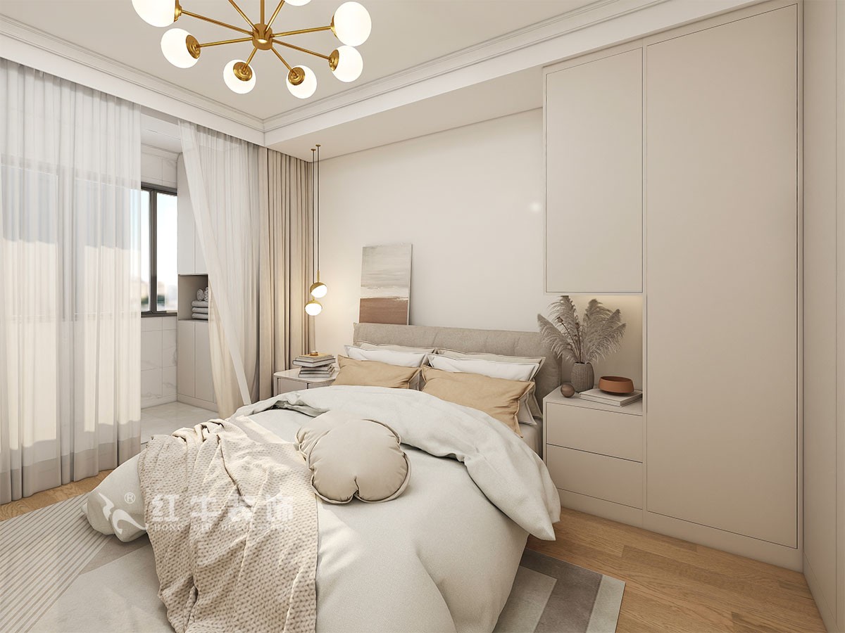 通過(guò)改造,把原有的主臥與陽(yáng)臺(tái)的隔墻拆除,把陽(yáng)臺(tái)的采光和戶(hù)外的風(fēng)景全部引入主臥。原始的陽(yáng)臺(tái)留出洗衣房保存的功能性,使得整個(gè)主臥視覺(jué)的縱深感更加強(qiáng)烈。