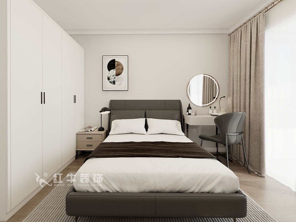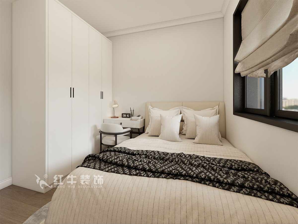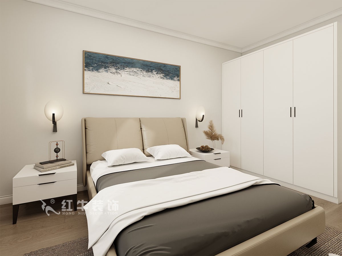 此案主要是婚房裝修,在舒適度上要求比較高,臥室是整套房子中最私人也是最體現(xiàn)出溫馨休閑感的空間,在設(shè)計時體現(xiàn)出靜謐舒適的感覺,并且與其他空間有明顯的區(qū)別。沙發(fā)在整個區(qū)域沒地方擺放,而是設(shè)計了吧臺充當(dāng)墻體,讓沙發(fā)有靠山,漂亮的吧臺是一個亮點,又能起到分割空間的作用。廚房窗戶比較大,光線就能更好地進到門廳,衛(wèi)生間也能單獨一個區(qū)域。