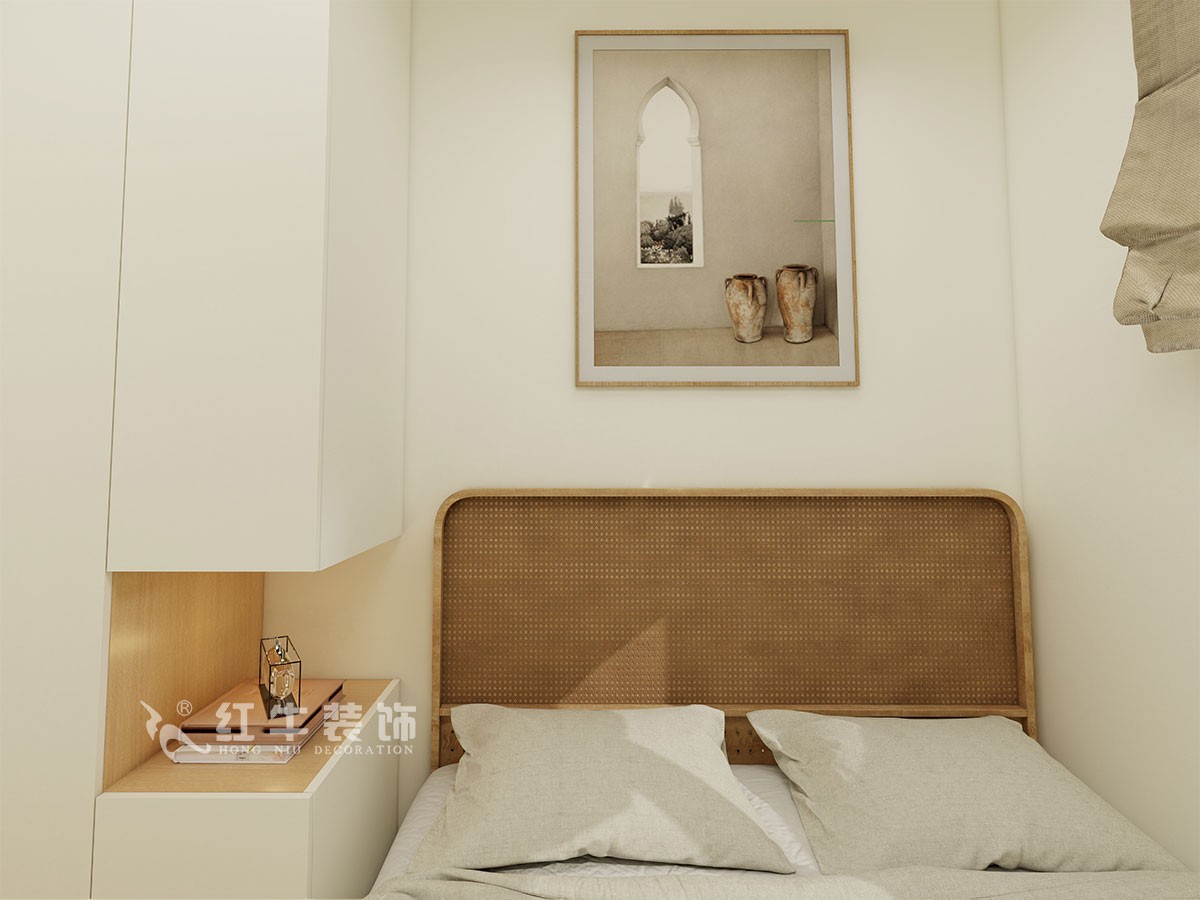 臥室說明:搭配大面積的白色定制衣柜,床頭的光源以不同形勢呈現(xiàn),及滿足不同燈光需求,又恰到好處地起到了裝飾效果,使整體臥室空間呈現(xiàn)明亮、溫柔的舒適狀態(tài)。
