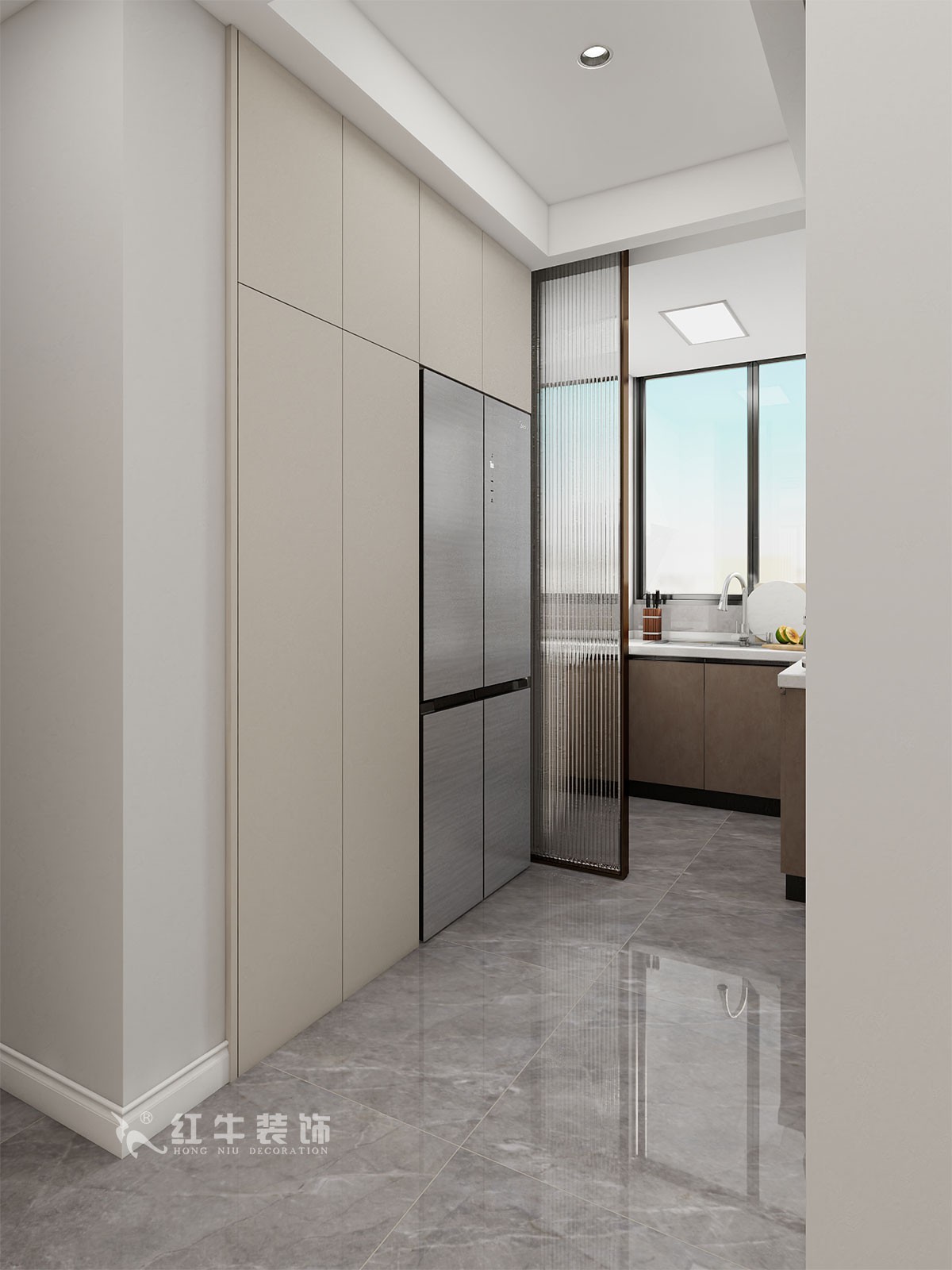 沙發(fā)在整個區(qū)域沒地方擺放,于是設(shè)計了吧臺充當(dāng)墻體,讓沙發(fā)有靠山,漂亮的吧臺是一個亮點,又能起到分割空間的作用。廚房窗戶比較大,光線就能更好地進到門廳,衛(wèi)生間也能單獨一個區(qū)域。
