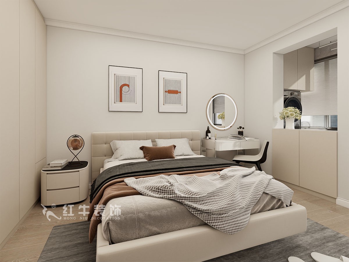 此案主要是婚房裝修,在舒適度上要求比較高,臥室是整套房子中最私人也是最體現(xiàn)出溫馨休閑感的空間,在設(shè)計時體現(xiàn)出靜謐舒適的感覺,并且與其他空間有明顯的區(qū)別。