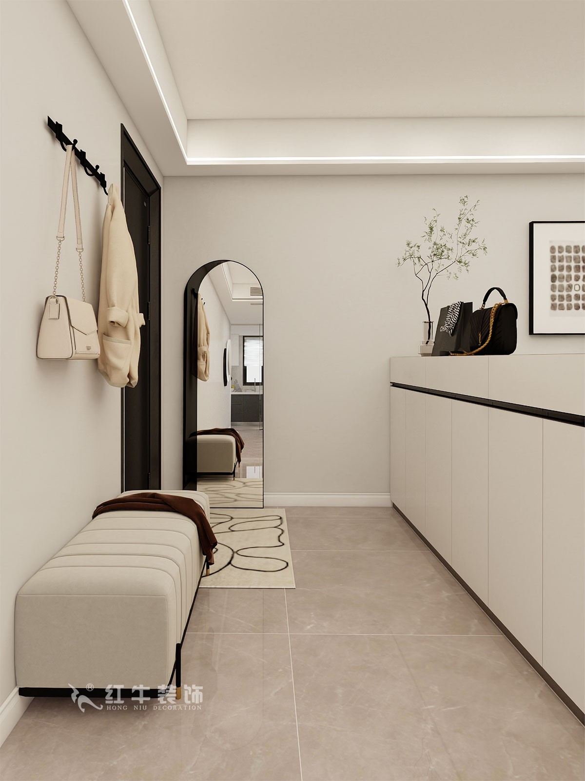 入戶一字形鞋柜,暖白色門板為主色調(diào),黑色作為點綴,干凈清爽,融入掛衣鉤、換鞋凳、穿衣鏡等設(shè)計。