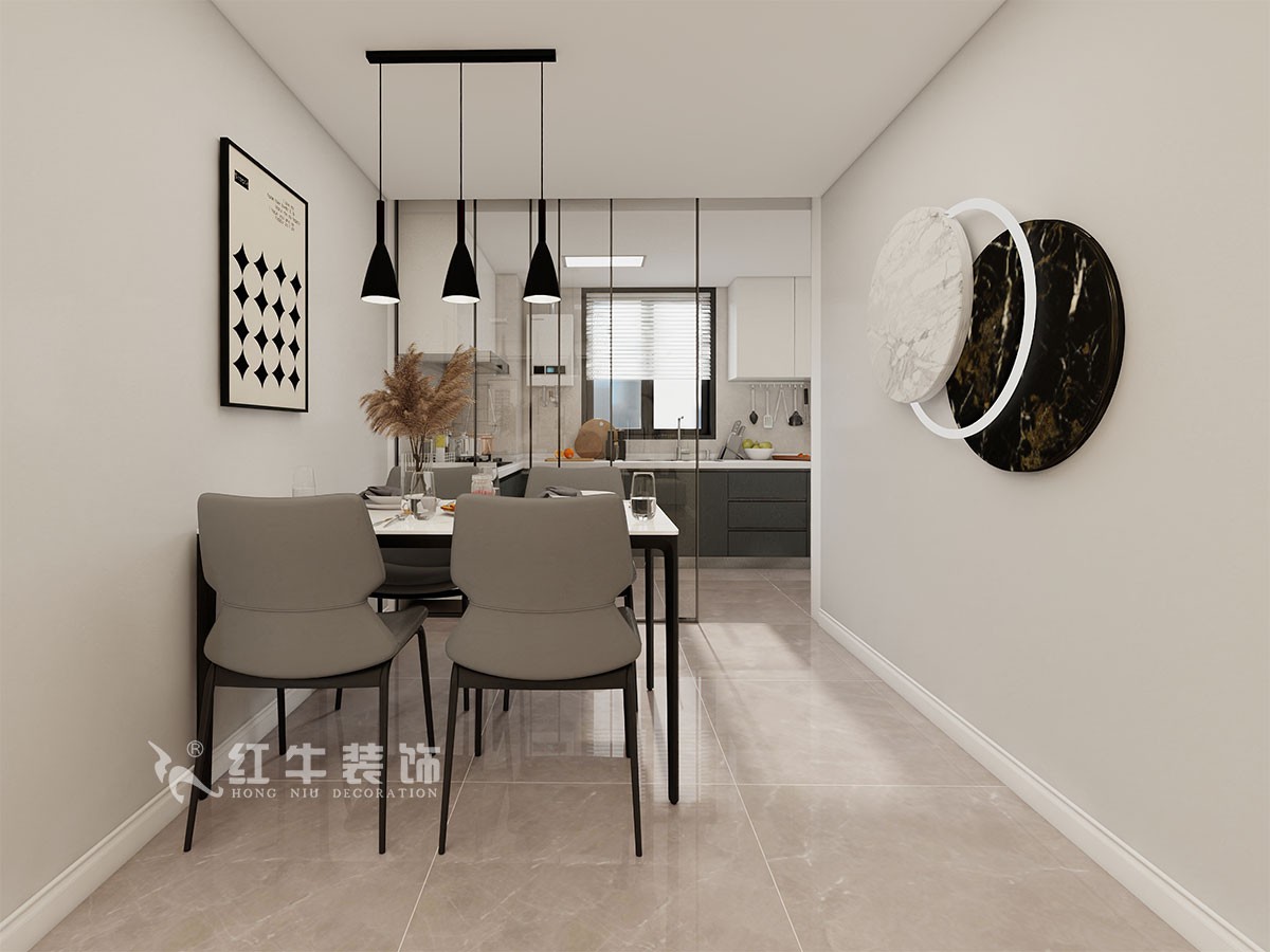 餐廳延續(xù)了整體的設(shè)計風(fēng)格和色調(diào),白色巖板方桌,灰色皮藝餐椅、裝飾畫、燈具等,使用餐氛圍充滿儀式感。
