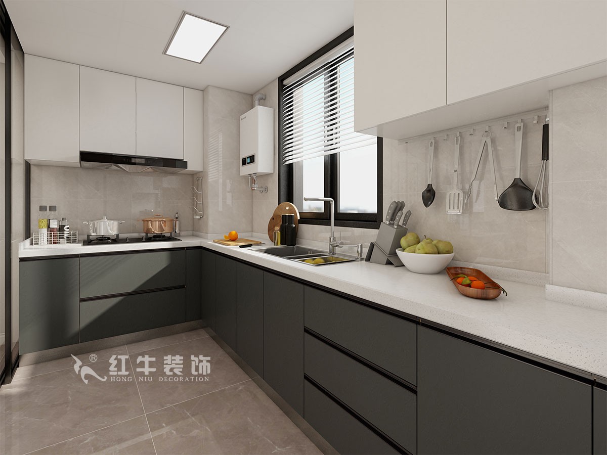 廚房白色的吊柜,灰色的地柜,滿足使用者日常收納儲物,整個廚房空間簡潔、高級。