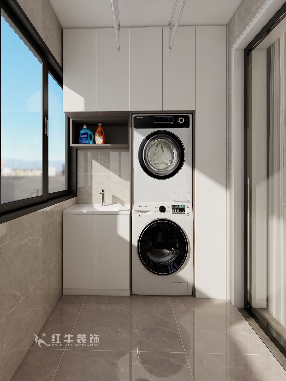 置頂式陽臺柜與開放式設(shè)計進(jìn)行收納儲物,嵌入式洗烘設(shè)備、洗衣臺盆,解決了日常所需,又給空間增加了些許層次。