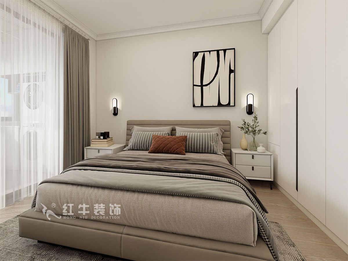 主臥以白灰為基調(diào),床頭背景墻用抽象的藝術(shù)畫進(jìn)行裝飾,灰色飾面、軟包床頭,床品與原木色地板仿佛融為一體,使空間更加簡潔、時尚。