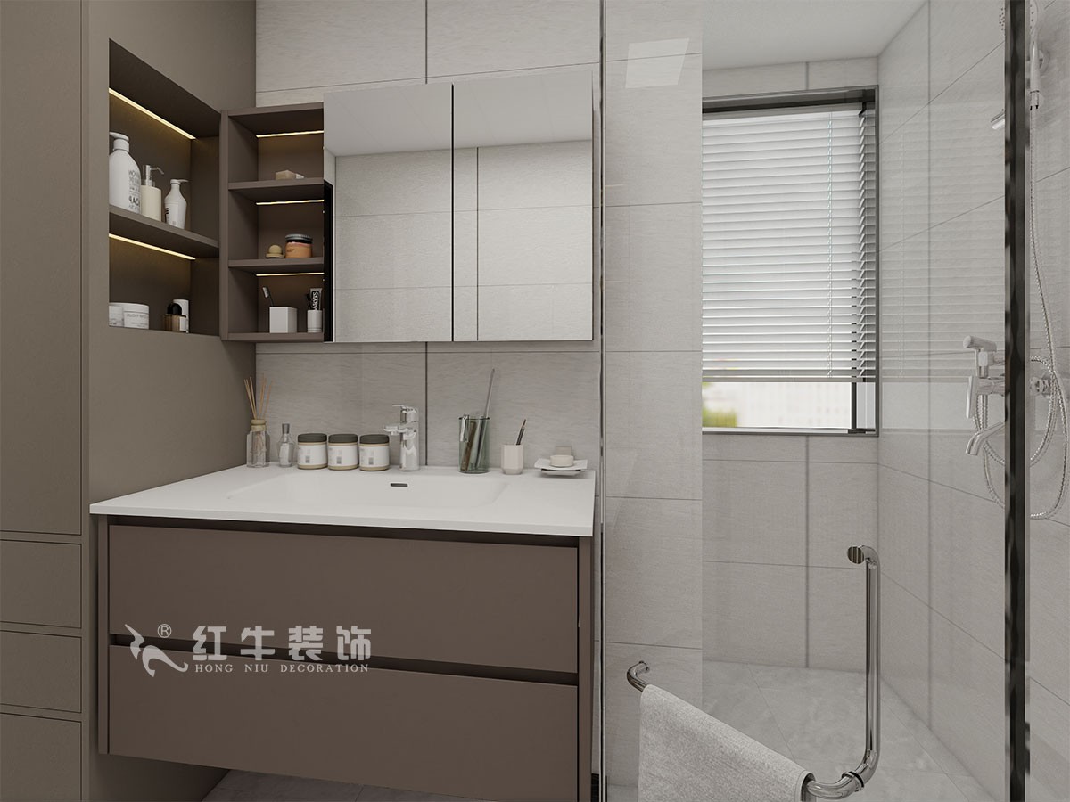 衛(wèi)生間說明:干區(qū)選擇整體色彩搭配干凈、大方,選擇大尺寸淺灰色瓷磚上墻,氛圍感溫馨感滿滿。