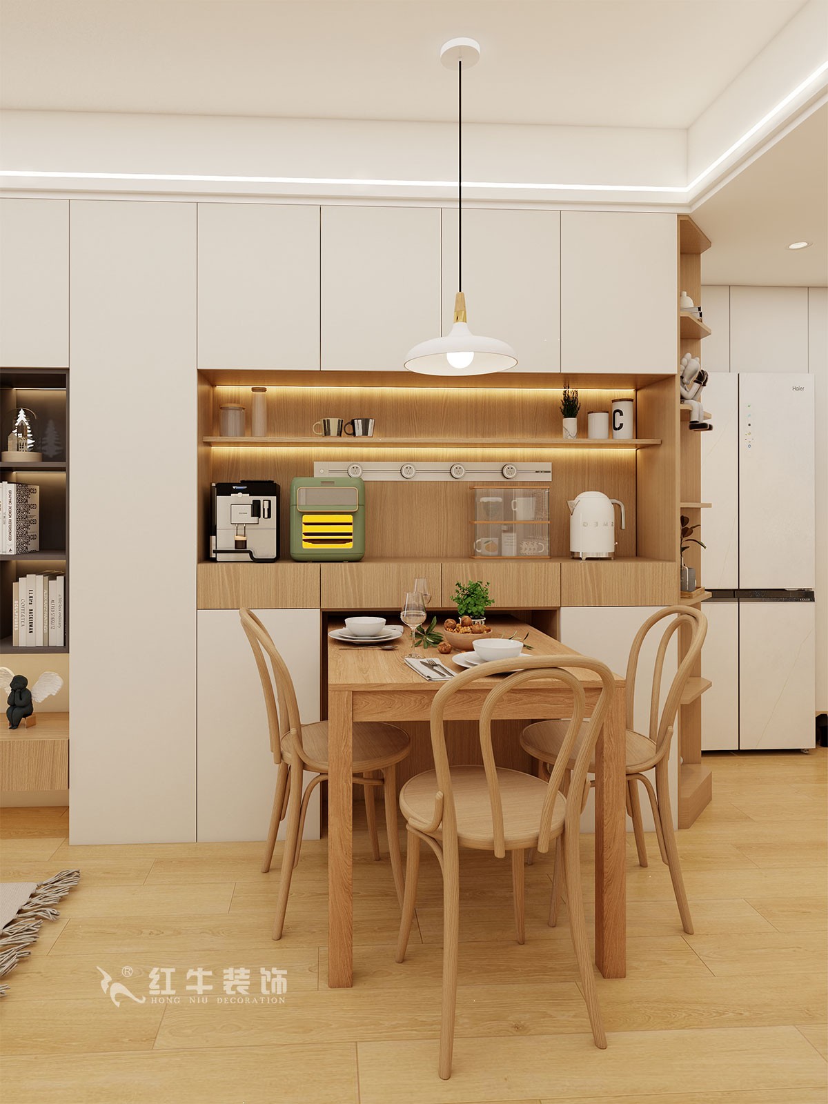 餐廳說明:餐邊柜擴(kuò)充了廚房?jī)?chǔ)物的不足,也提升了適合家庭的生活質(zhì)量。