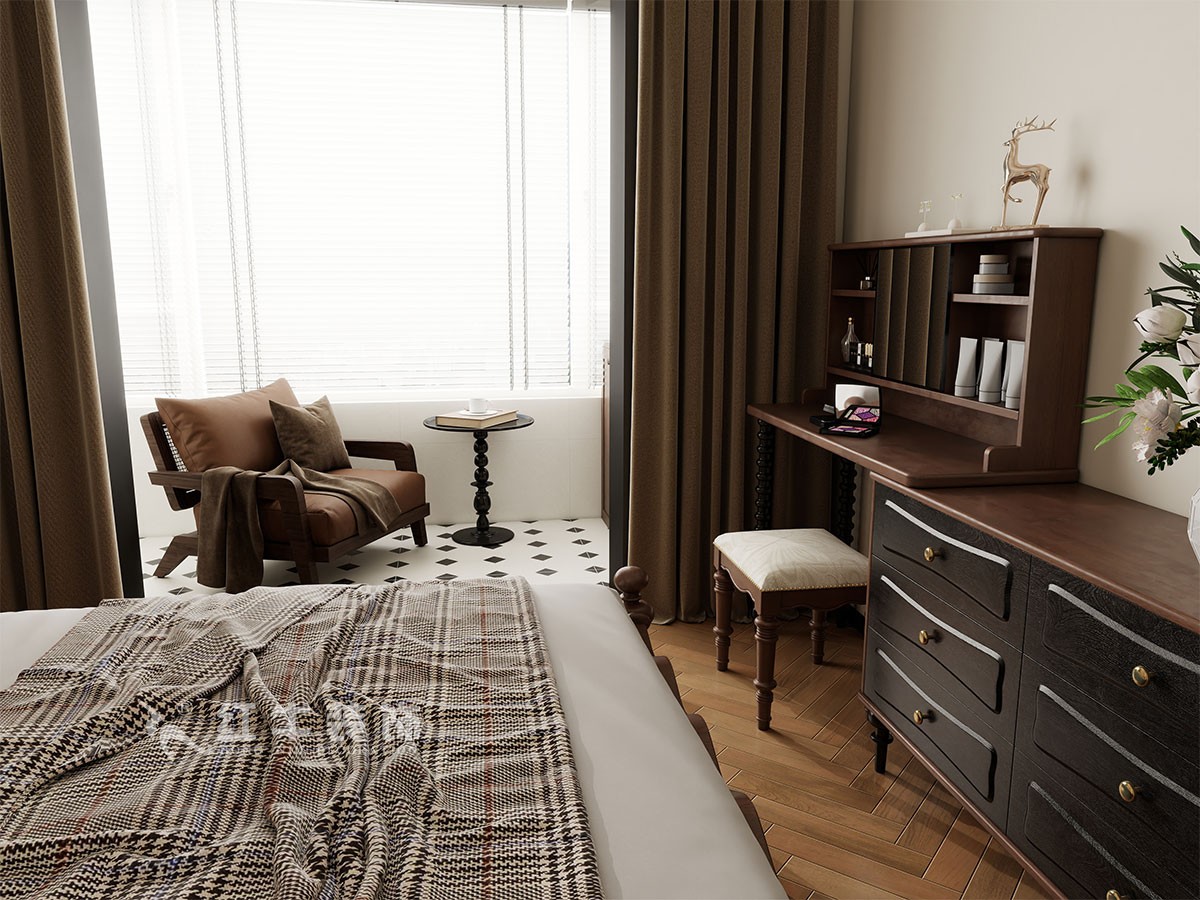 風(fēng)格定為復(fù)古風(fēng),人字拼的地板為中古風(fēng)奠定了基礎(chǔ),黑色木色相間,這些材質(zhì)與溫潤(rùn)的木色形成對(duì)比,看上去就不會(huì)很單調(diào),因?yàn)轱L(fēng)格大面積使用了深色,擔(dān)心空間暗,柜門用了白色,形成反差,從而達(dá)到視覺(jué)效果。累了坐在這,親手沖一杯咖啡,很是安逸。