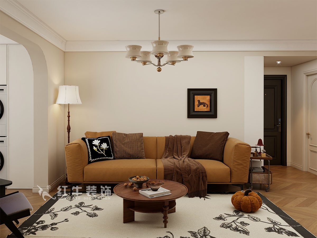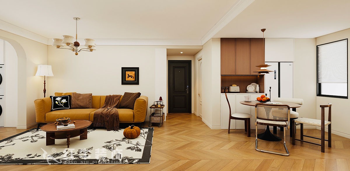 空間布局:開放式客餐廳通過拱形門洞劃分區(qū)域,增強(qiáng)空間層次感;鋼琴線作為視覺焦點,搭配復(fù)古線條與暖光照明,營造優(yōu)雅氛圍。