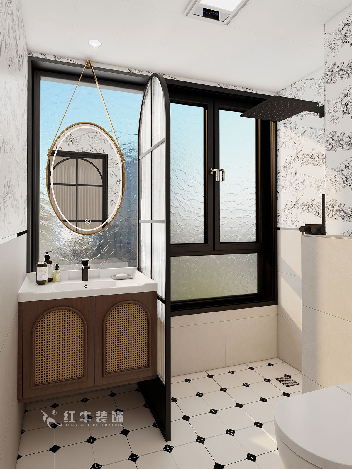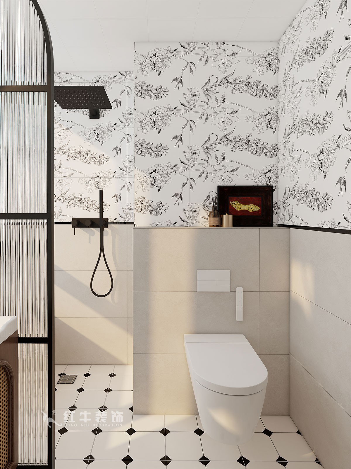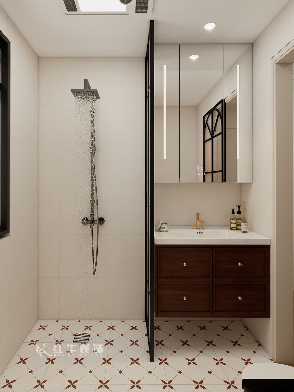 材質(zhì)運用:全屋通鋪木紋磚,保留自然質(zhì)感的同時提升耐用性;衛(wèi)生間采用彩色花磚與幾何腰線組合,局部點綴黑色五金,凸顯復(fù)古趣味。
