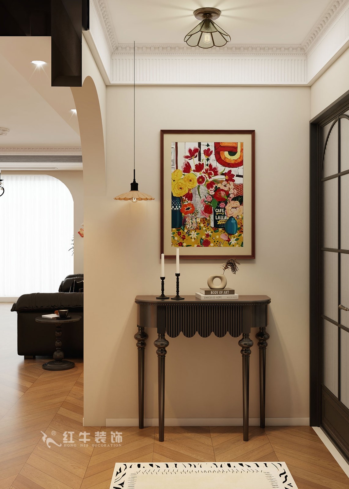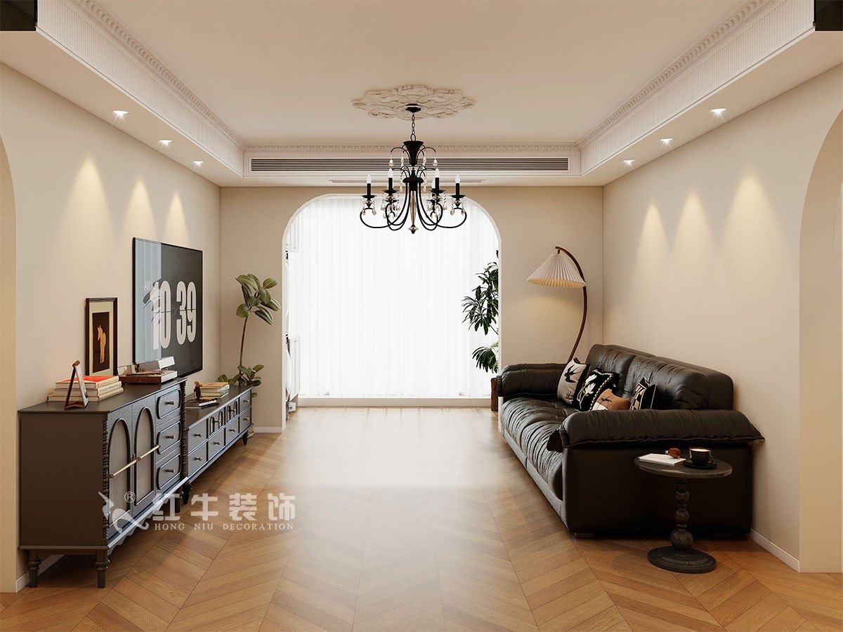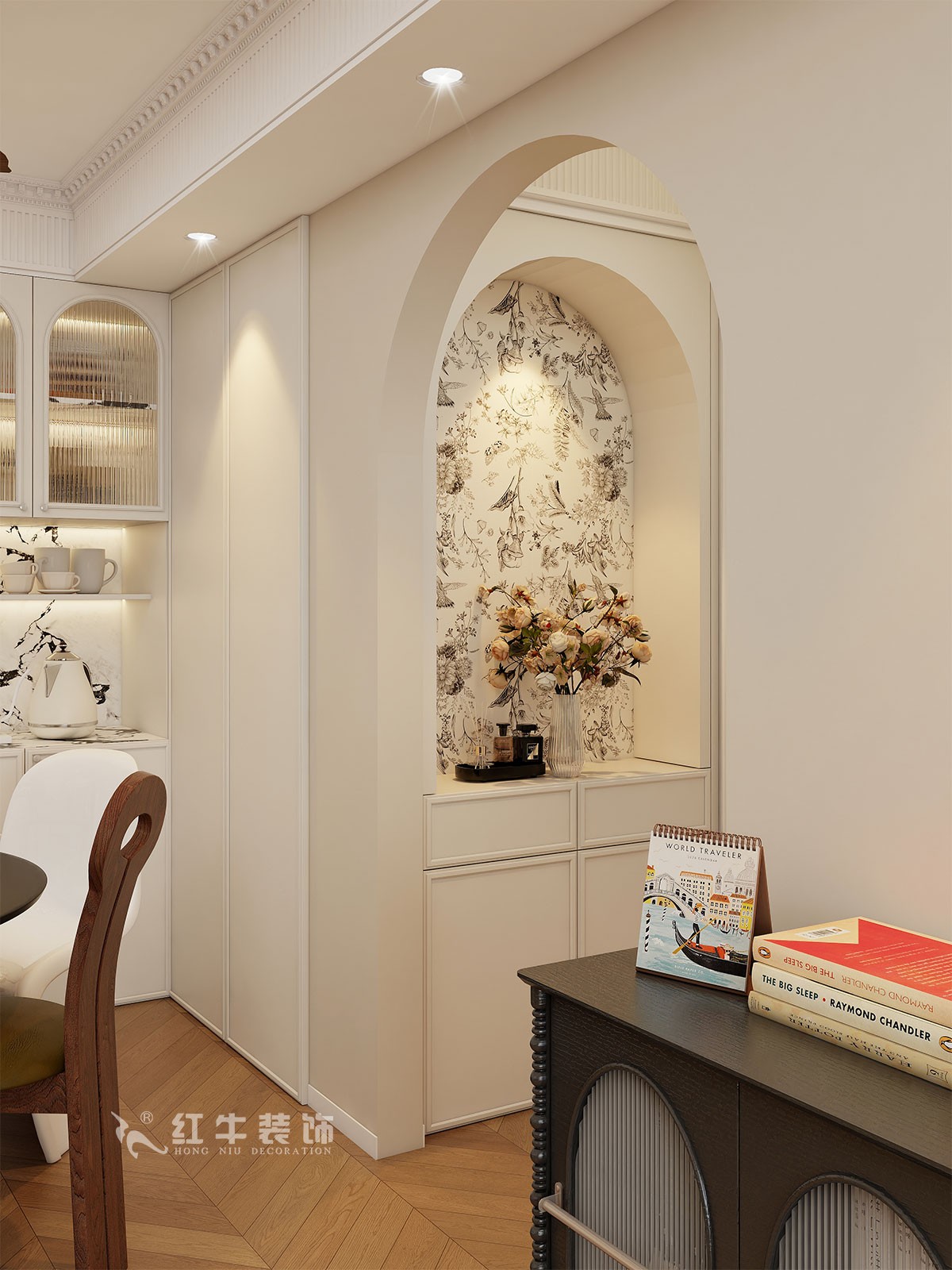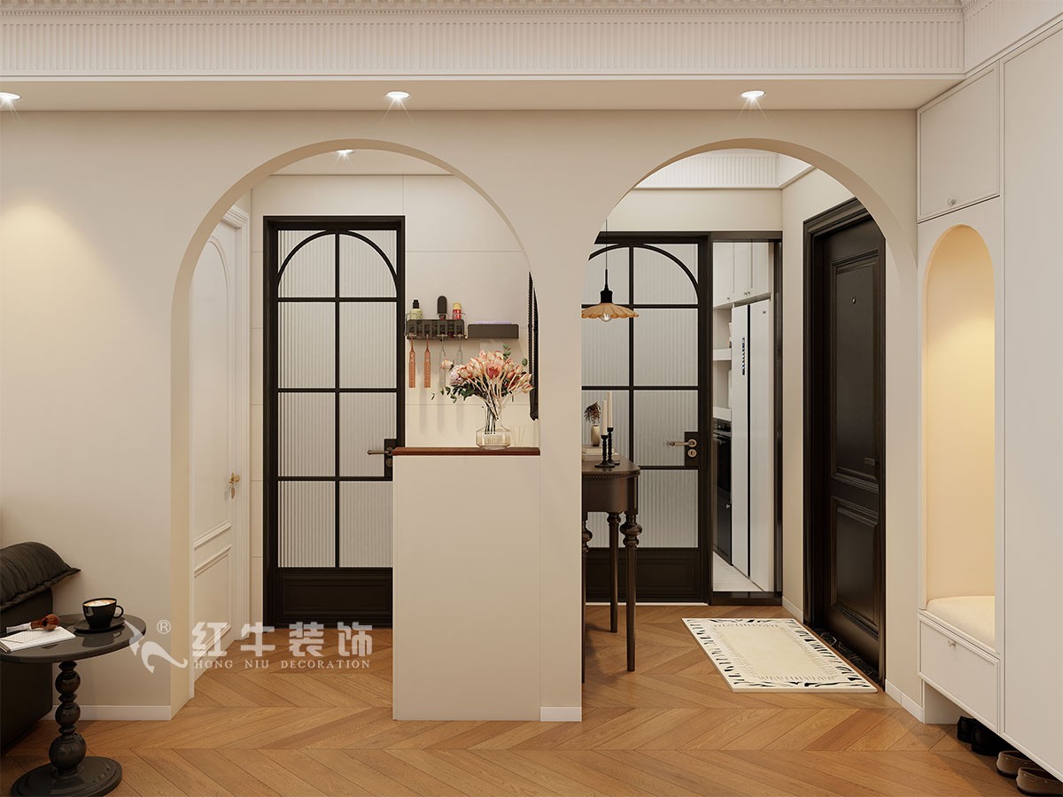 小兩口居住,女業(yè)主對裝修希望比較時尚大氣,希望未來的房子實用、大氣,最終確定了法式復(fù)古風(fēng),而本案在設(shè)計時其特色是將設(shè)計的元素、色彩、照明、原材料簡化到最少程度。但是對材料的舒適度要求很高。因此,考慮全屋通鋪木紋地板磚,配合拱形門,以極少的元素去表達(dá)空間的氛圍感。