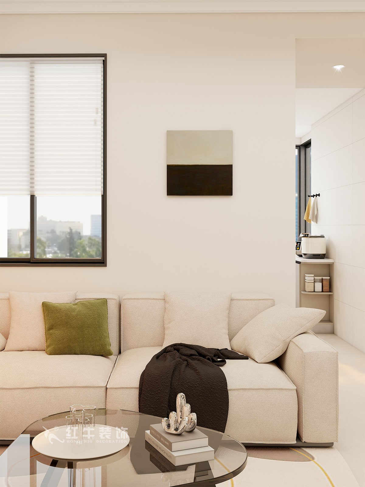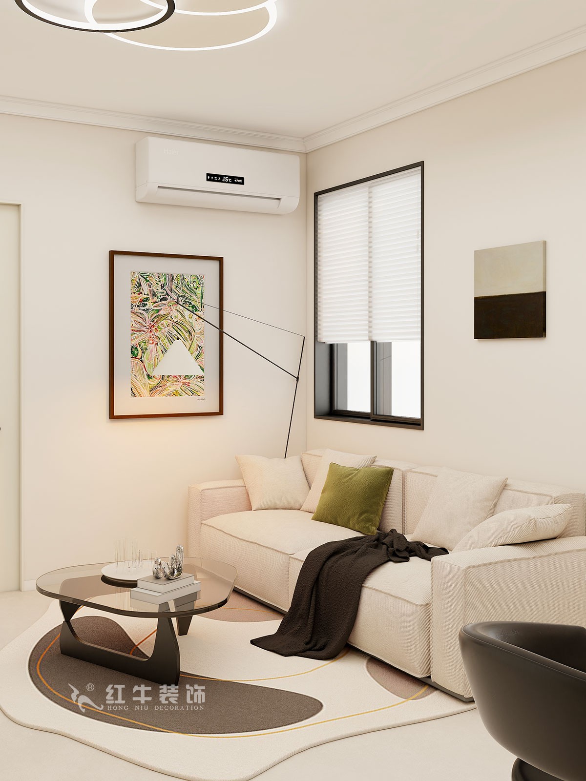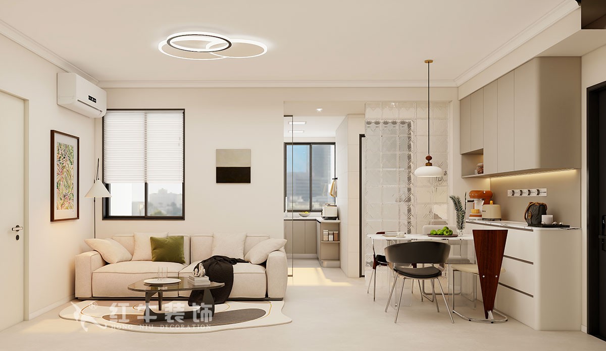 客廳說明:客廳空間墻面大面積留白,柔和的色彩,也為空間注入了時(shí)尚與溫度。