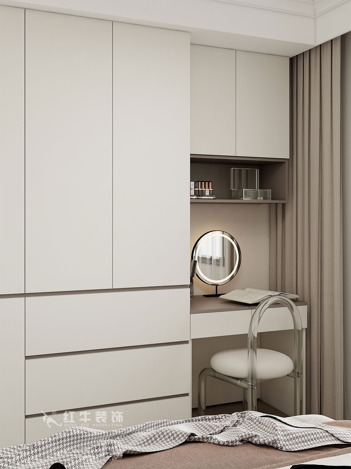 臥室說明:搭配大面積的白色定制衣柜,床頭的光源以不同形勢(shì)呈現(xiàn),既滿足不同燈光需求,又恰到好處地起到了裝飾效果,使整體臥室空間呈現(xiàn)明亮、溫柔的舒適狀態(tài)。
