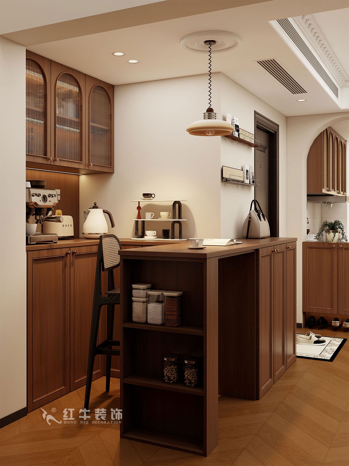 主要解決的是收納的功能,做了去客廳化的設(shè)計(jì),在樓梯拐角做了一個(gè)吧臺(tái)區(qū),兩個(gè)區(qū)域來(lái)分解餐廳的功能,同時(shí)又增加了家庭氛圍。房間還是以實(shí)用和增加收納功能為主。