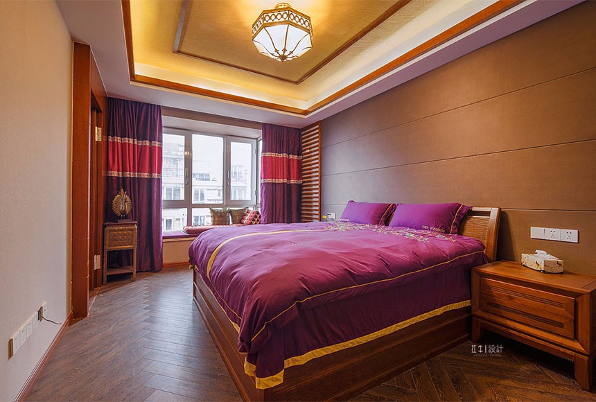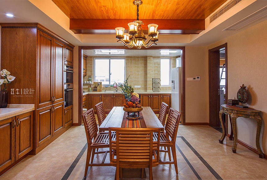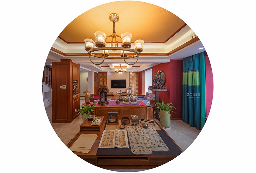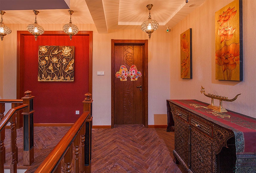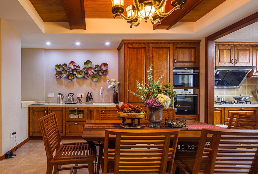 整個空間不難發(fā)現(xiàn)墻面上采用了很多的實木作為裝飾,電視背景墻兩個的實木雕花隔斷,配合象征吉祥的荷花圖案的壁紙,頂面的不同材質的粱柱結合,實木的家具,使得家里透著沉穩(wěn),墻面采用了米灰色系的墻紙,作為家里大面的襯景,使得家里安靜溫馨。在南面的這個墻面采用了東亞南民族的紅色,一下把整個風格的熱情帶動了起來,用沖突的綠色窗簾,空間又提亮了很多。實木描金的雕刻,頂上的純銅的燈飾,使得家里沉穩(wěn)中透著貴氣。