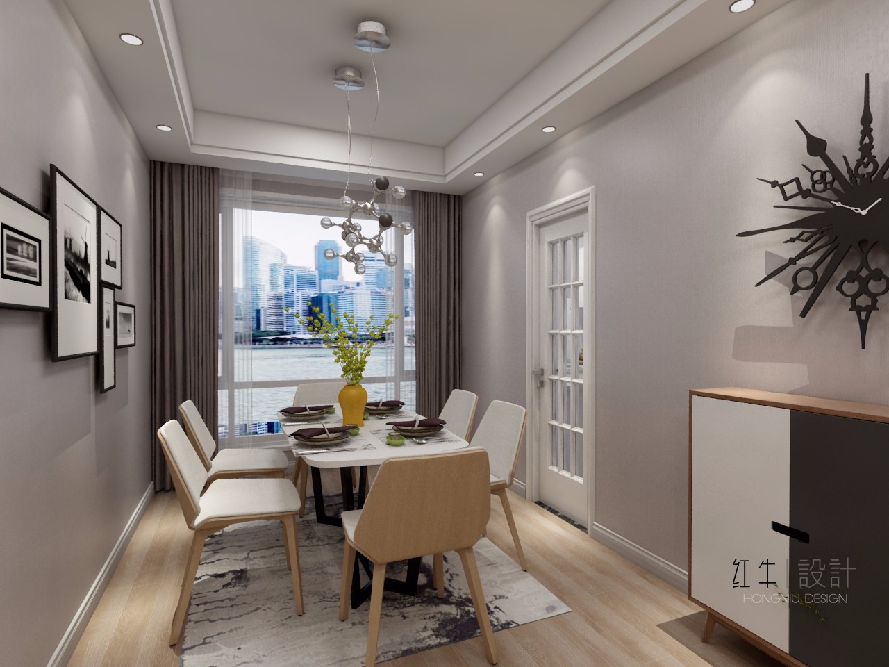 此案為北歐風(fēng)格,設(shè)計,簡潔、干練,讓家中呈現(xiàn)一種自然的舒適、干凈之美。一股濃濃的北歐范, 白色的餐椅與原木色的餐桌搭配,現(xiàn)代與自然元素想結(jié)合,溫暖的色調(diào)一致搭配。讓整個餐廳溫暖起來。讓家居生活更輕松隨性。