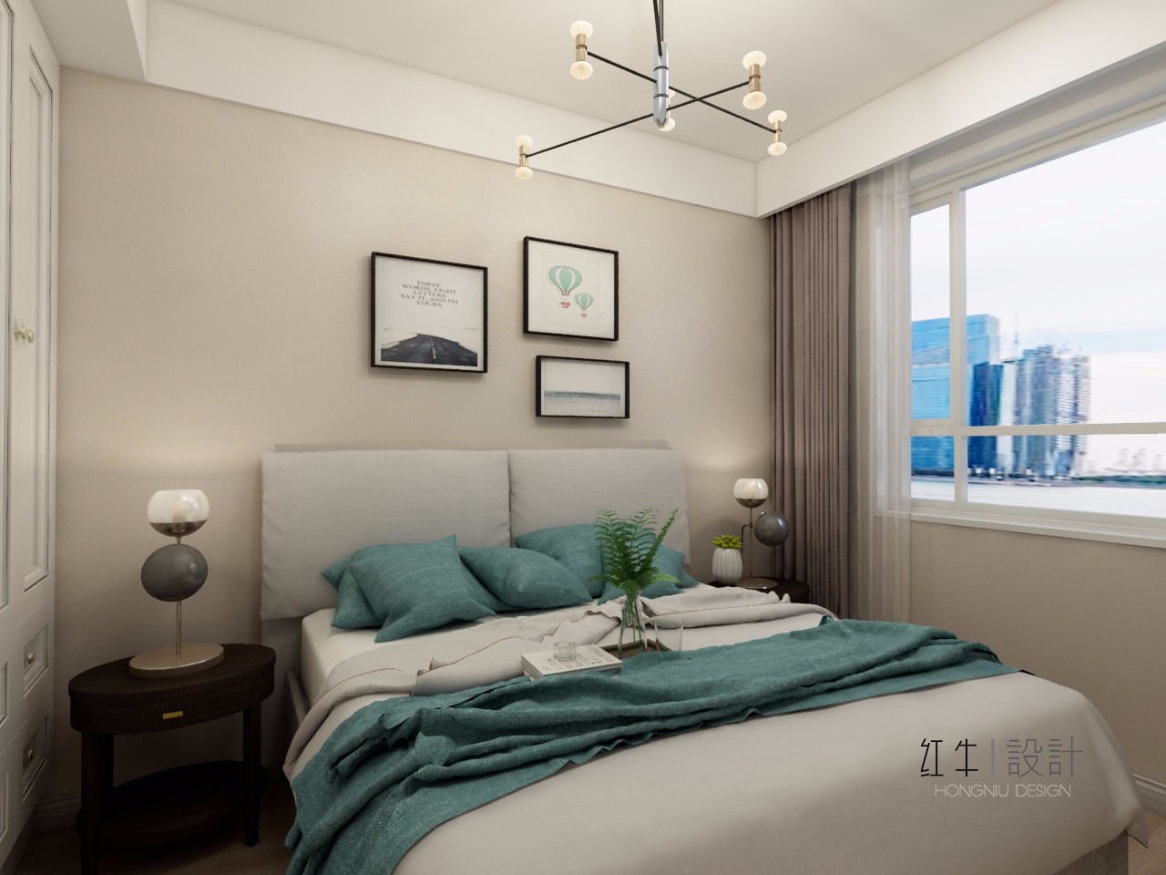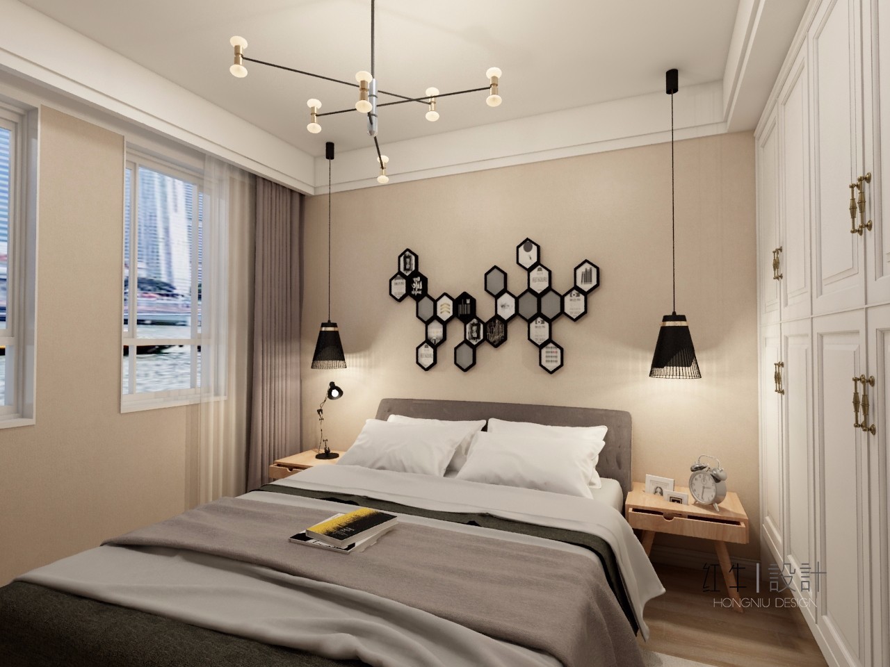 床頭安裝了兩盞吊燈,不僅能解放出桌面空間,還能提升了空間格調(diào)。