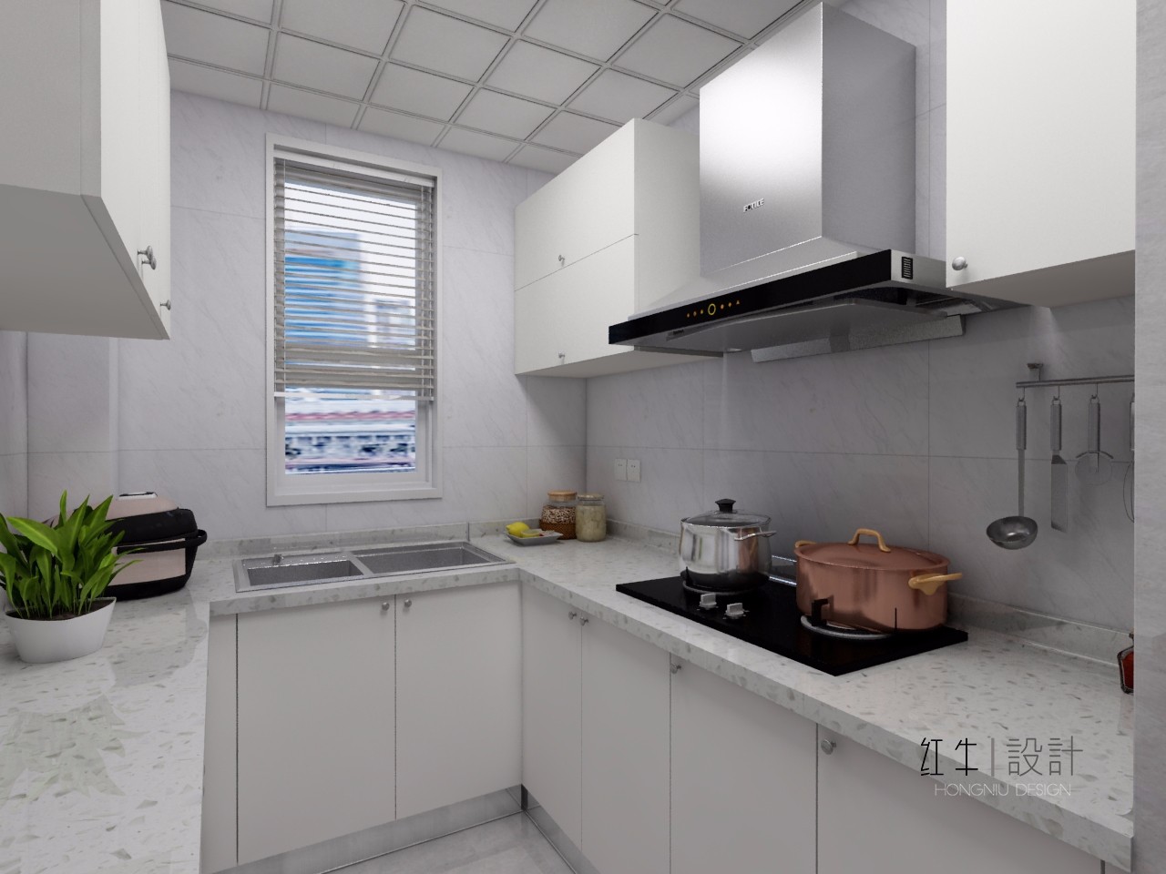 油煙機(jī)旁對稱安裝了兩個小吊柜,另一面只安裝了一個吊柜,疏密有度,不會顯得太過緊湊。