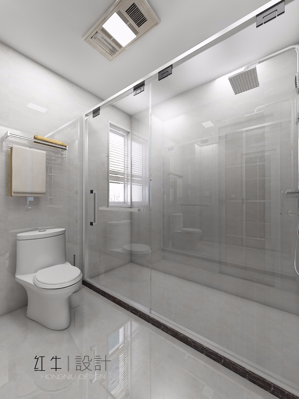 本案的干濕分離做的徹底,洗手臺(tái)被安在外面,濕區(qū)面積非常寬敞,加上淺色系的瓷磚,顯得干凈、明亮。馬桶上方的置物架可以放一些干爽的小物,下方來掛毛巾,實(shí)用性很強(qiáng)。