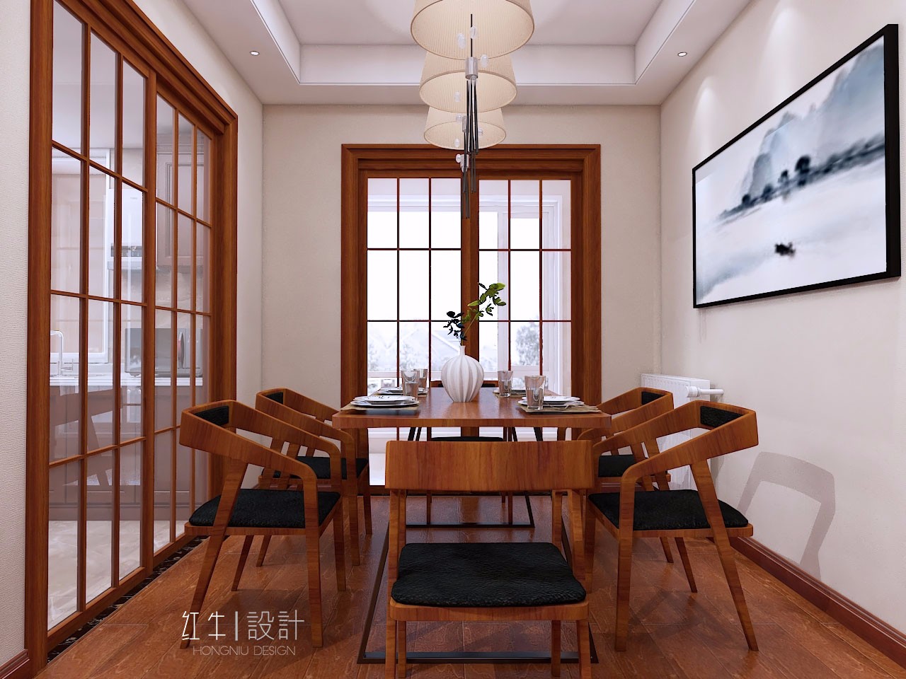 餐廳前面是陽臺,旁邊是廚房,都通過木框透明玻璃門隔開,玻璃的通透感讓房間看起來寬闊明亮了許多。