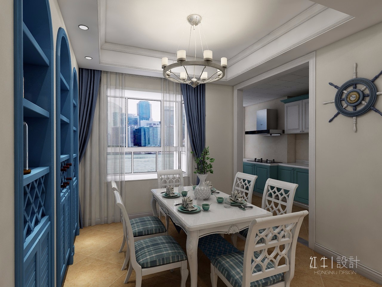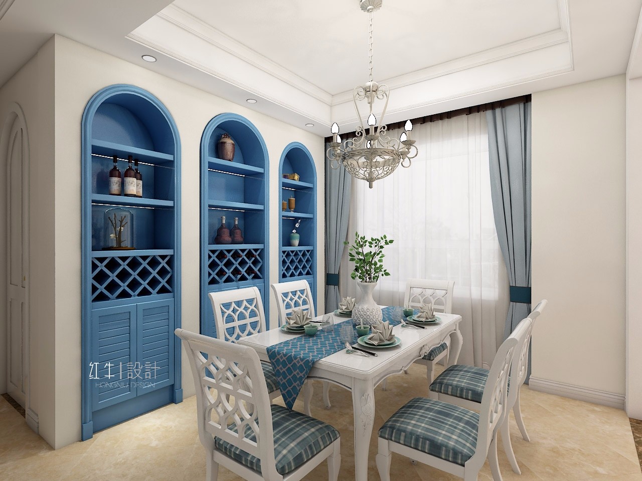 以白色為主色調(diào)的餐廳,顯得尤為純凈雅致,最吸睛的就是藍(lán)色的內(nèi)嵌的置物架,頂部的拱形設(shè)計就是地中海風(fēng)格的典型特征。