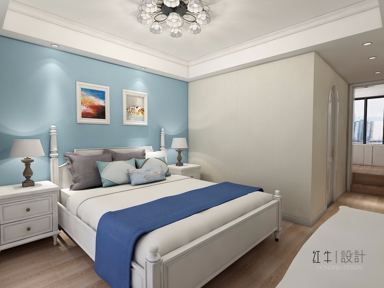淺藍(lán)色的背景墻簡非常清爽,給人一種置身海洋的感覺。墻上對稱懸掛的兩幅裝飾畫,又增添了幾分時尚氣息。