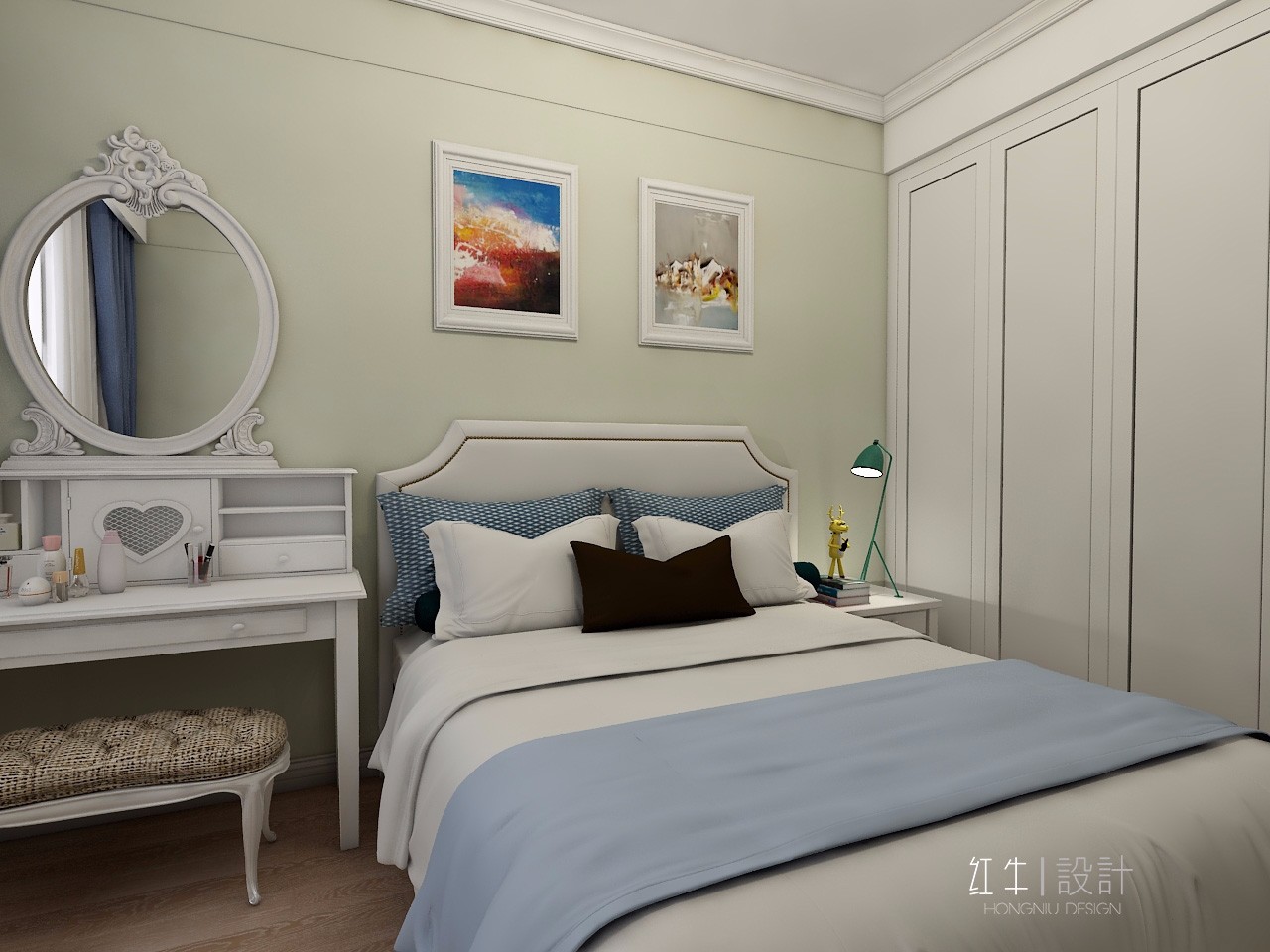 這間是次臥,梳妝臺是必不可少的家具,它的造型優(yōu)雅、還散發(fā)著一種浪漫氣息。