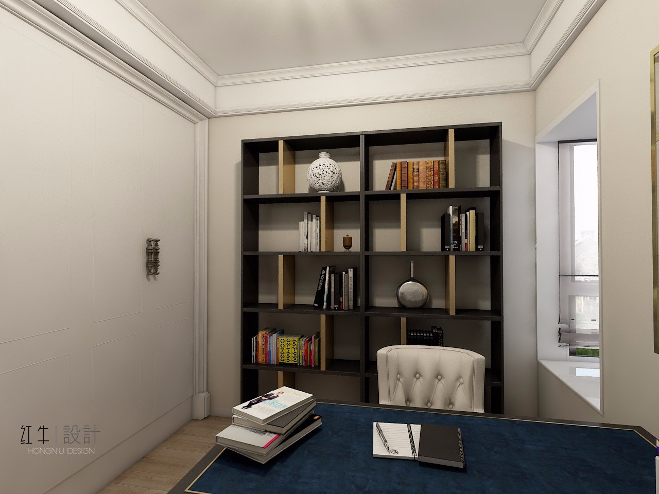 這就是主臥大套房中的書房,書架依墻而立,上面擺放著工藝品和書籍,看似無意卻頗有藝術(shù)感,剩下的就是看書學(xué)習(xí)時使用的一桌一椅,總體來說,書房簡單卻不乏味。