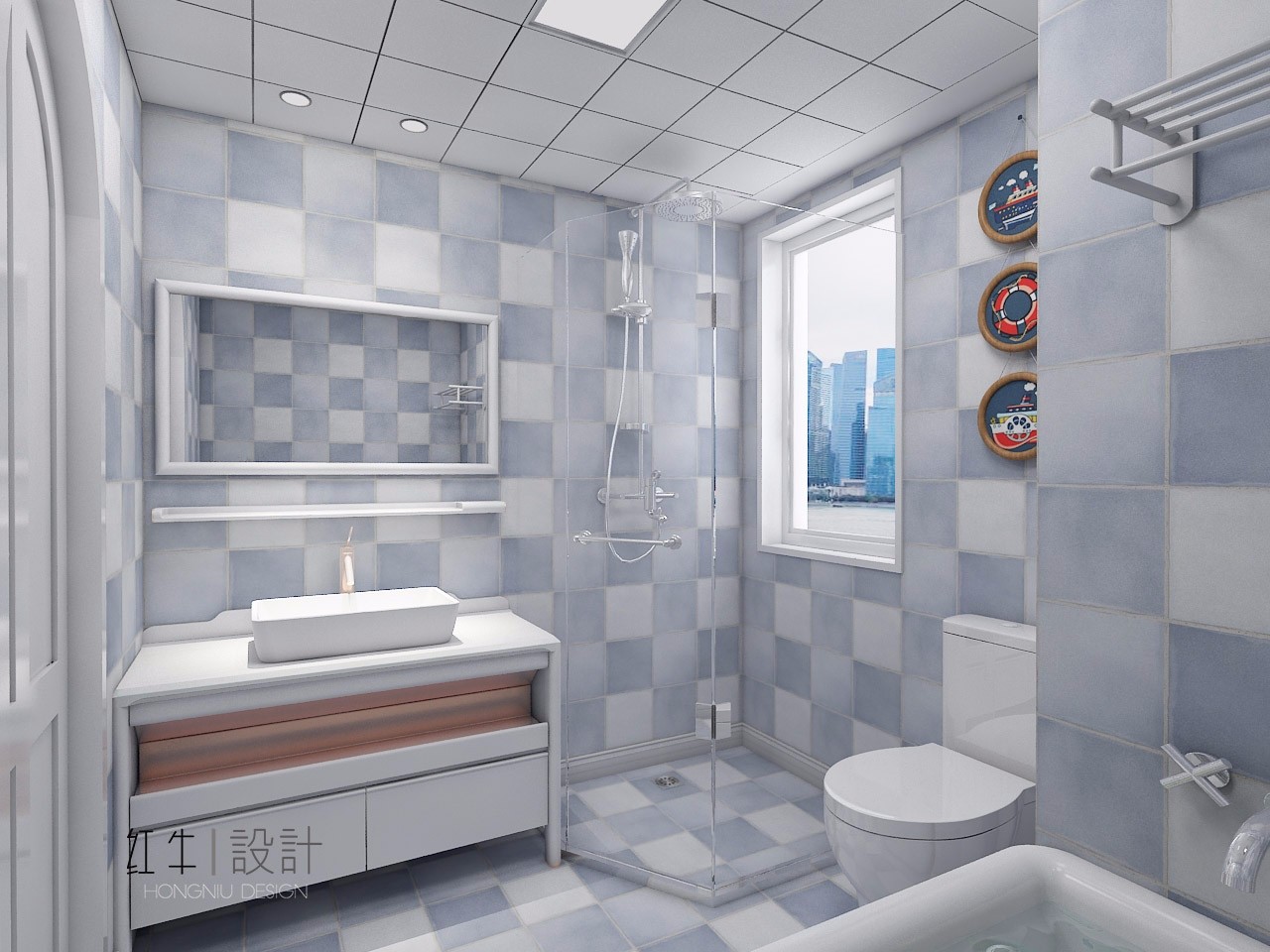 角落處隔出了淋浴房,透明玻璃材質(zhì)顯得很美觀。墻上豎直排列懸掛的三幅裝飾畫,內(nèi)容是輪船、游泳圈,使人聯(lián)想到海洋。