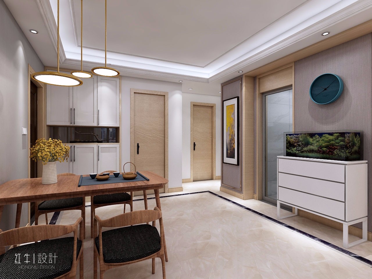 木質(zhì)餐桌與餐椅,簡約而不簡單,餐桌上花枝裝飾以及茶具的渲染,顯得很有韻味。