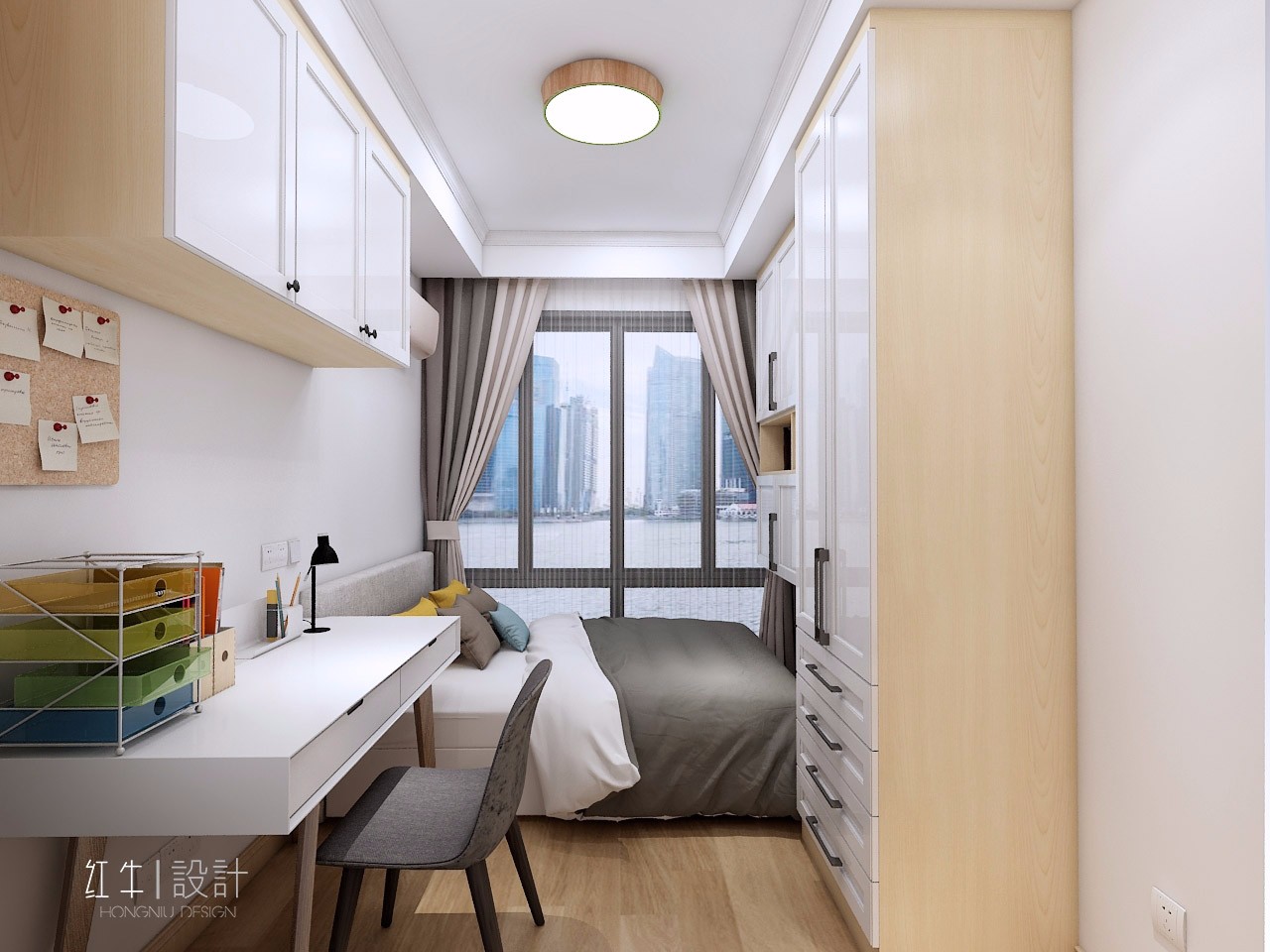 次臥,雖然面積不大,利用率卻不小,到處是柜子。到頂衣柜下面有四個(gè)抽屜,是存放各種小物件的最佳場所。桌上、床前都是吊柜,中空部分可以放裝飾品。