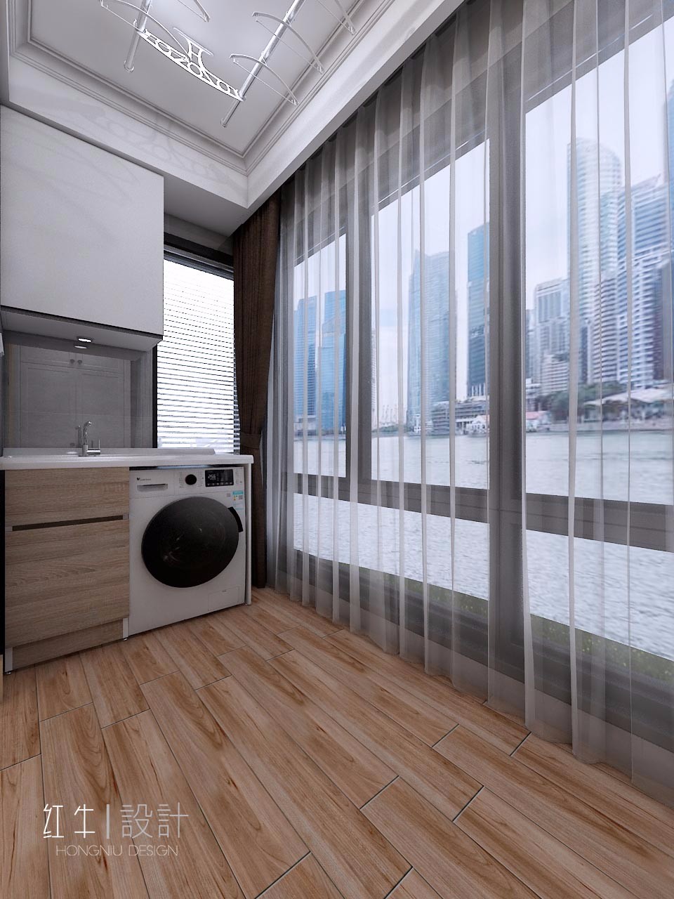 洗衣機(jī)放在陽臺,洗衣晾衣一氣呵成,不用為了晾衣服跑來跑去。木質(zhì)地板很有溫馨質(zhì)感。