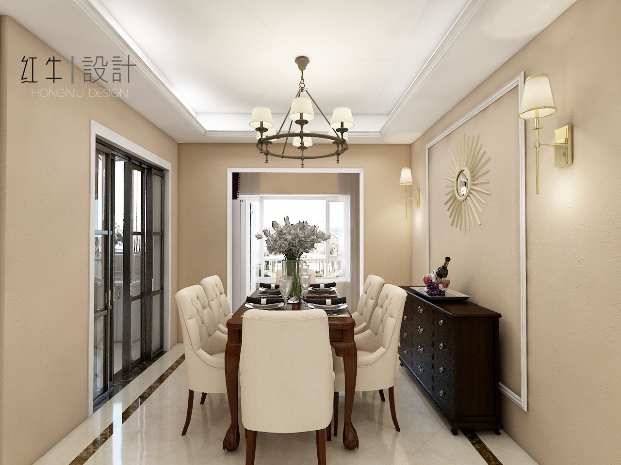 在客餐廳空間整潔有序的基礎上,又保留了通透性,深色的餐邊柜,打造出清爽潔凈的視覺感受,而米白色餐桌椅讓質感與沉穩(wěn)的氣息得到延伸,又和客廳來個呼應。