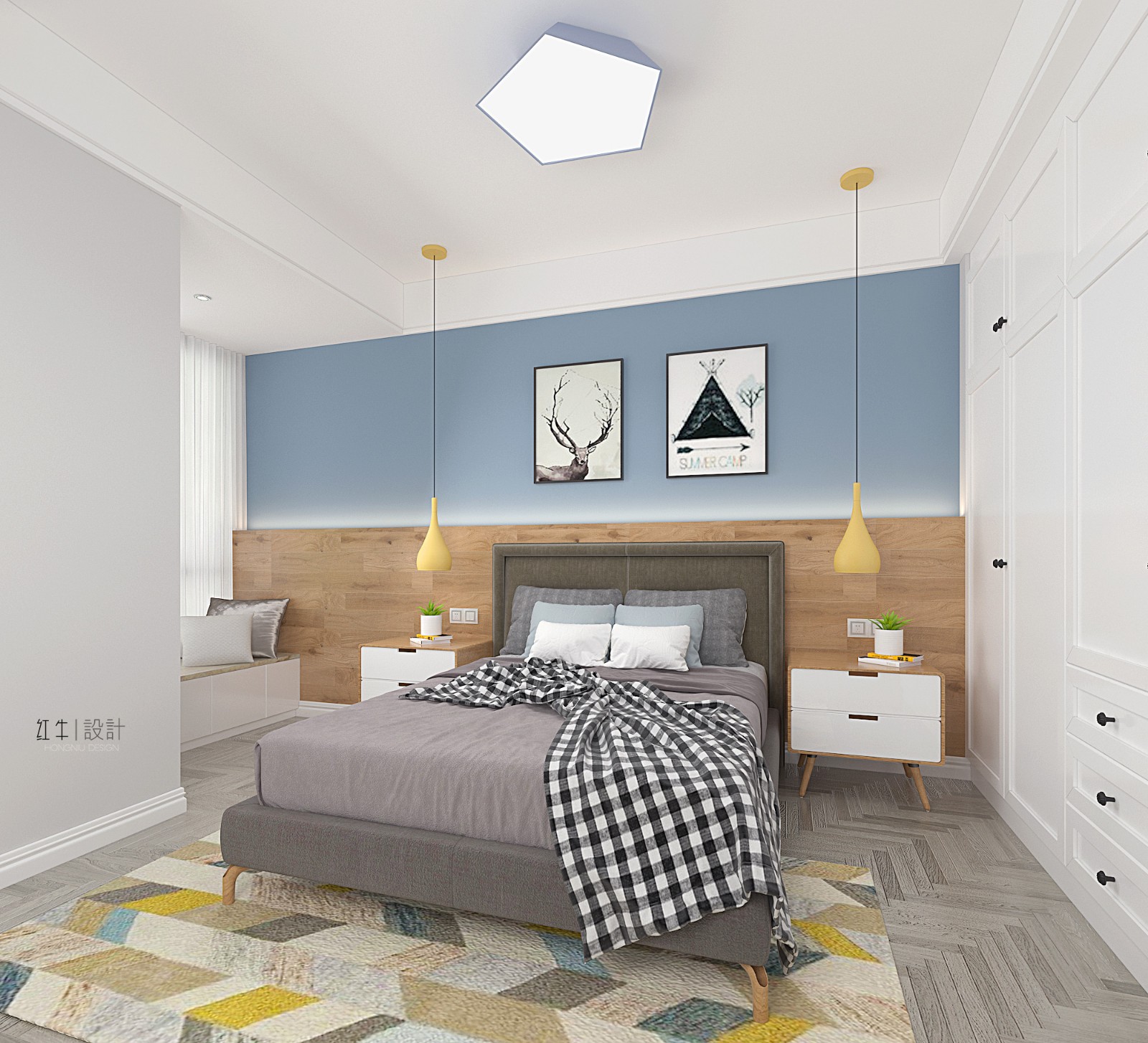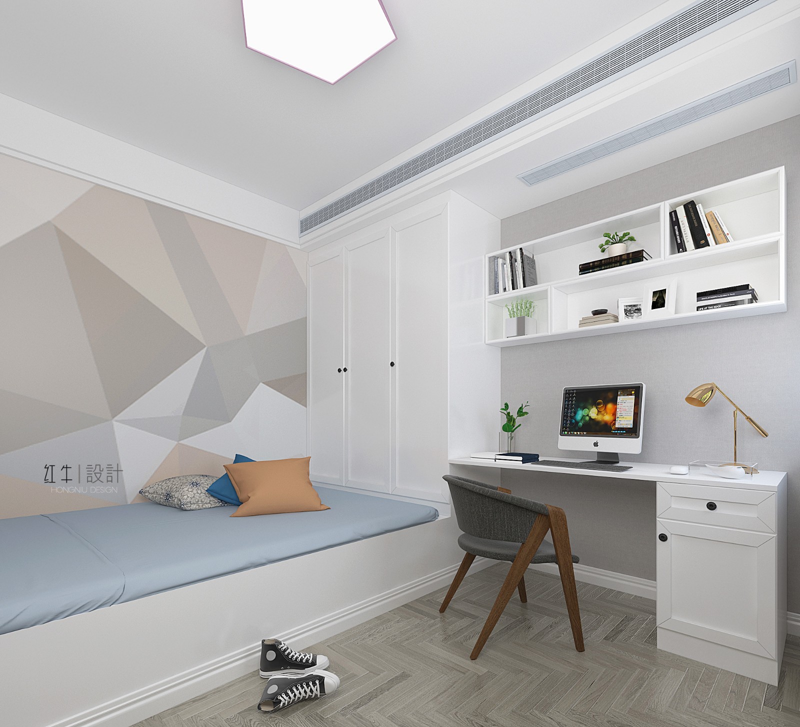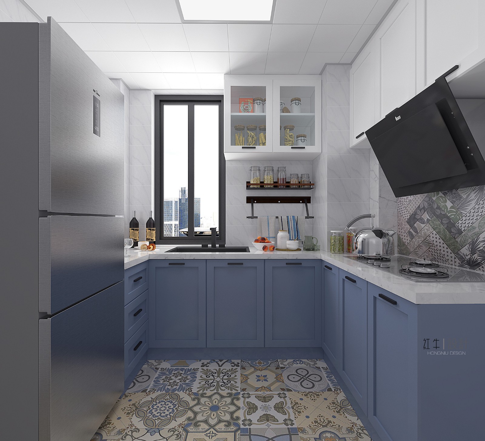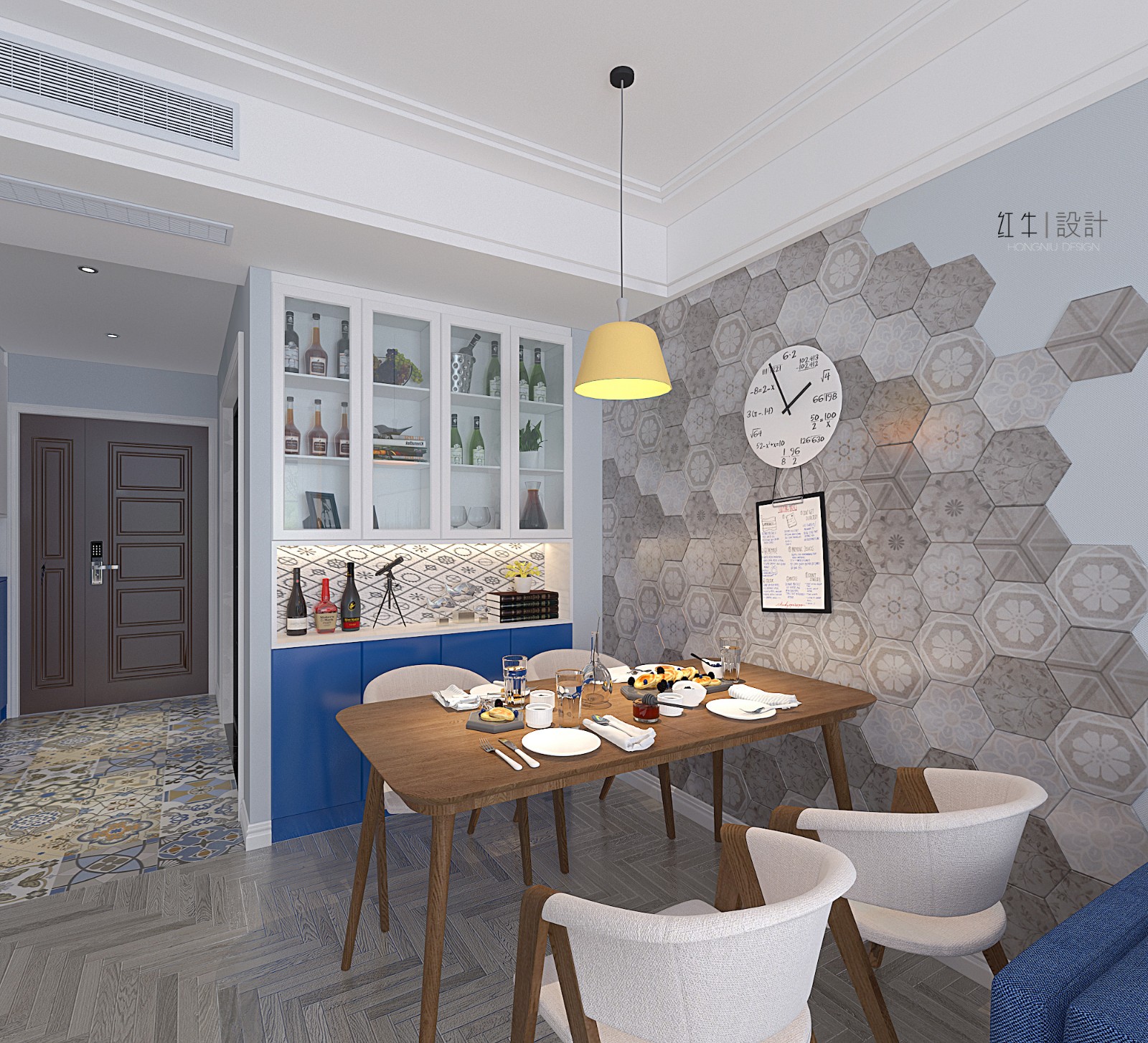 本案業(yè)主是位細(xì)心的單身男青年,對空間要求和軟裝顏色很有想法,在兩次的設(shè)計交流溝通后,我們定義風(fēng)格為自由簡約的北歐風(fēng)格,整體色調(diào)為高級的藍(lán)灰色。 業(yè)主性格開朗善于交流,希望家也是呈現(xiàn)輕松活潑的狀態(tài),所以在裝飾上,我們選用了一些多邊形足球磚和異形彩色磚。