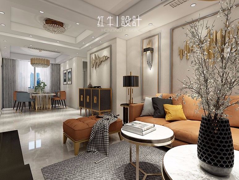 本案以陳設(shè)藝術(shù)品及金屬線條材質(zhì)來營造大氣、自然、輕奢的鉆石美學(xué)氛圍。墻面、地面、家具陳設(shè)等均以簡潔的造型、精細(xì)的工藝為其特征,強調(diào)品質(zhì)感和細(xì)節(jié)處理。在色彩搭配主要以暖色為主,溫馨的客桌花束、明亮的家具、直觀大氣的金屬材質(zhì),帶著淡淡的隨意,隨著輕輕的希翼讓人感受到的是空間彌漫的溫馨與舒暢。