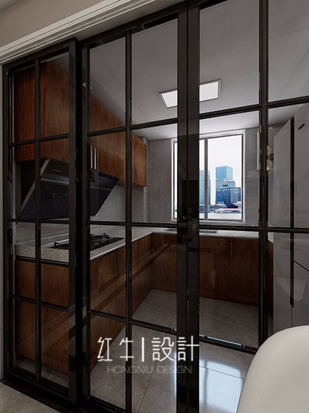 黑框玻璃門顏值頗高,自成視覺焦點(diǎn),隔而不斷,營(yíng)造出空間的通透感。