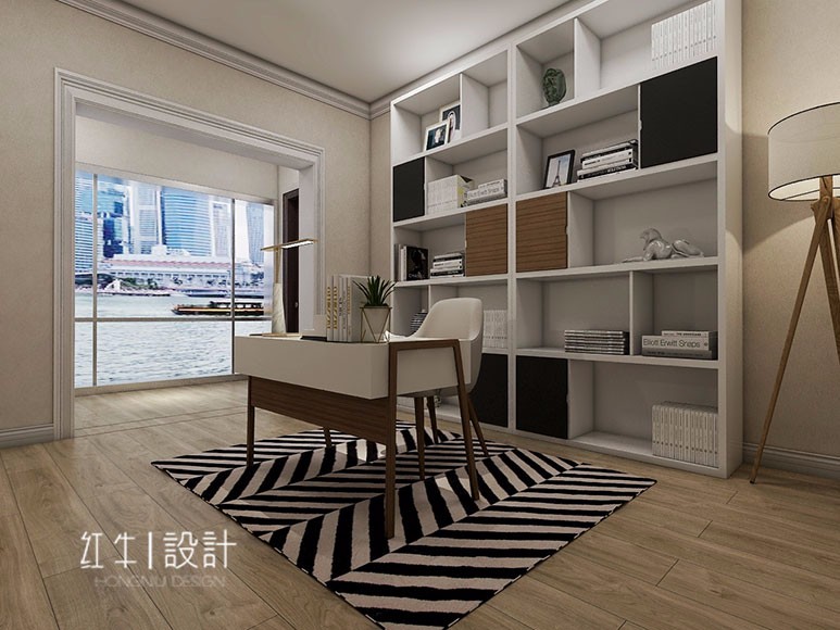 書房的面積很大,是很清靜的學(xué)習(xí)空間,書柜上擺了書籍等物品,既有實(shí)用性亦有裝飾性。