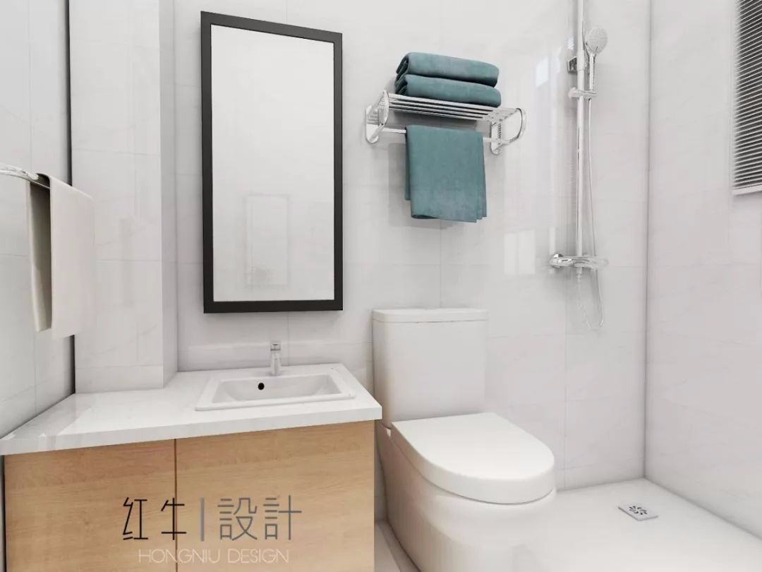 衛(wèi)生間白色墻磚搭配黑色地磚,墻地色彩對比太強,視覺上顯得比較狹小。并且內(nèi)部只設置了淋浴與馬桶,少掉的洗手柜對于日常生活來說還是非常必要的。