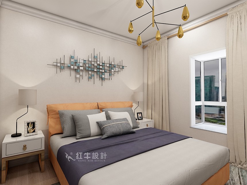 墻面上造型特別的裝飾品,成為進(jìn)門后視線的第一落點(diǎn),給空間增添美感。橘色的皮質(zhì)大床格外搶眼,帶來不錯(cuò)的視覺效果。