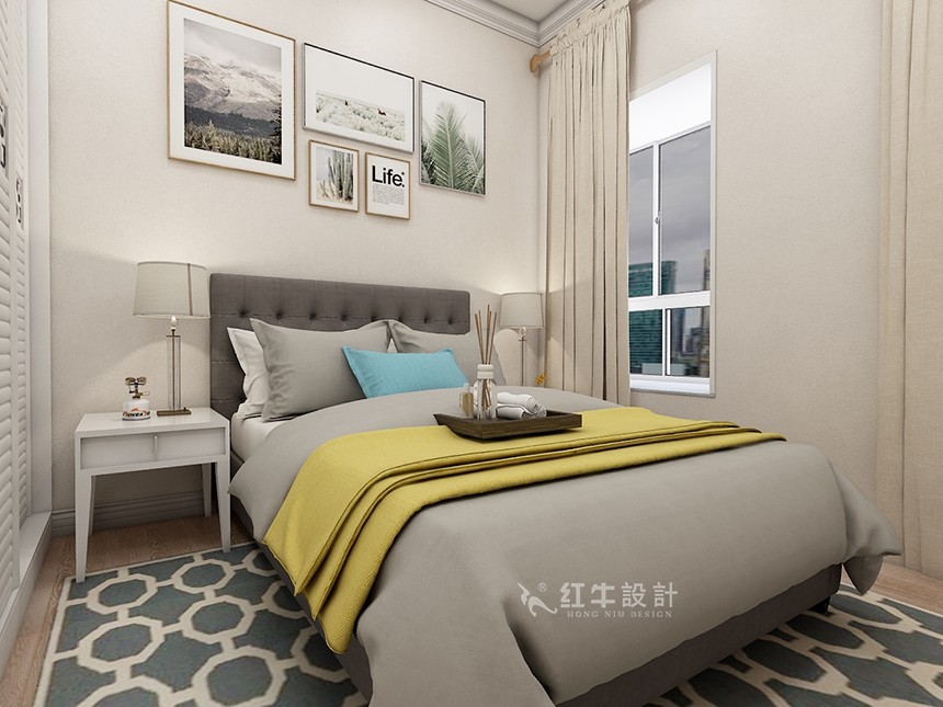 淺色的墻壁背景下,深灰色的大床加上淺灰色的床品,再搭配上地毯,整體感覺簡潔優(yōu)雅,黃色的加入提亮了空間,給人恰到好處的溫暖。