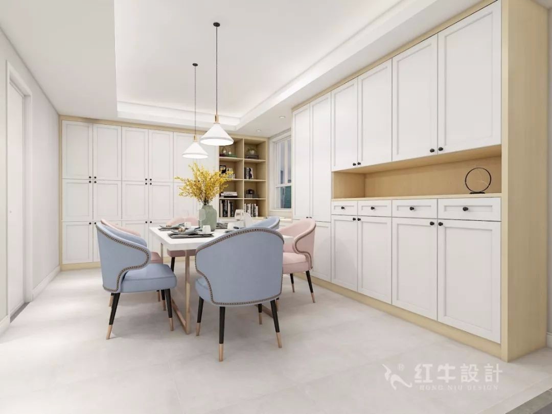 而色彩方面,設(shè)計(jì)師選擇將馬卡龍色融進(jìn)北歐風(fēng)的裝飾當(dāng)中,柔和的色調(diào)跟北歐風(fēng)自帶的清新風(fēng)格不謀而合,給人一種歸家的溫暖感。