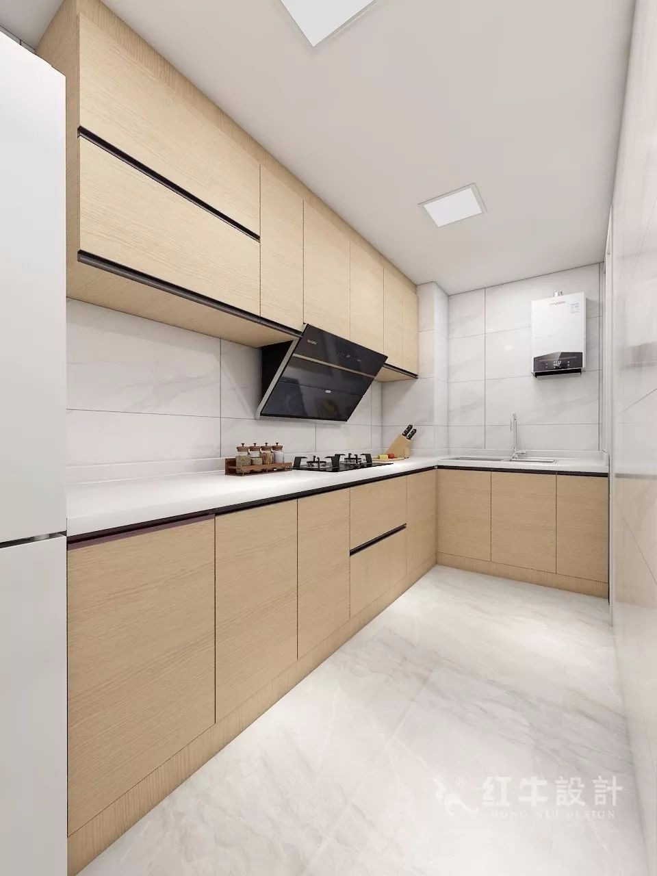 廚房呈L形布局,淺色的地磚、墻磚搭配木色櫥柜,有一種回歸自然的感覺。由廚房可以進(jìn)入衛(wèi)生間的后方的盥洗室,進(jìn)行一些物品的清潔。