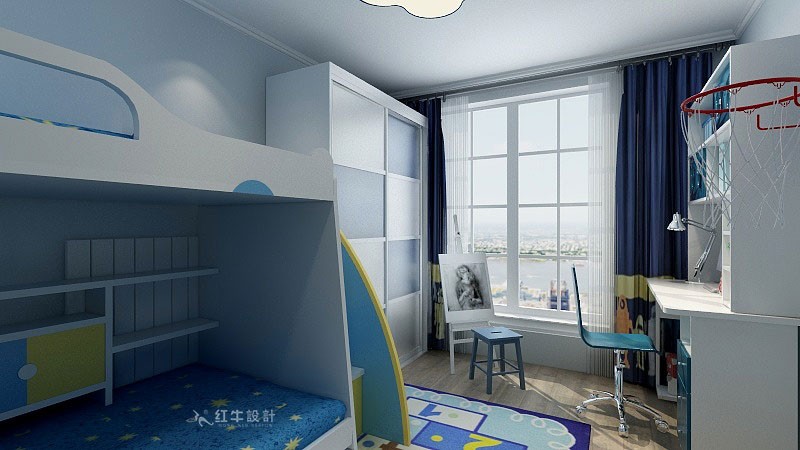整個空間以藍色為基調打底,淺灰色復合地板,墻面用簡單的線條勾勒出整個空間的格調,清新淡雅。