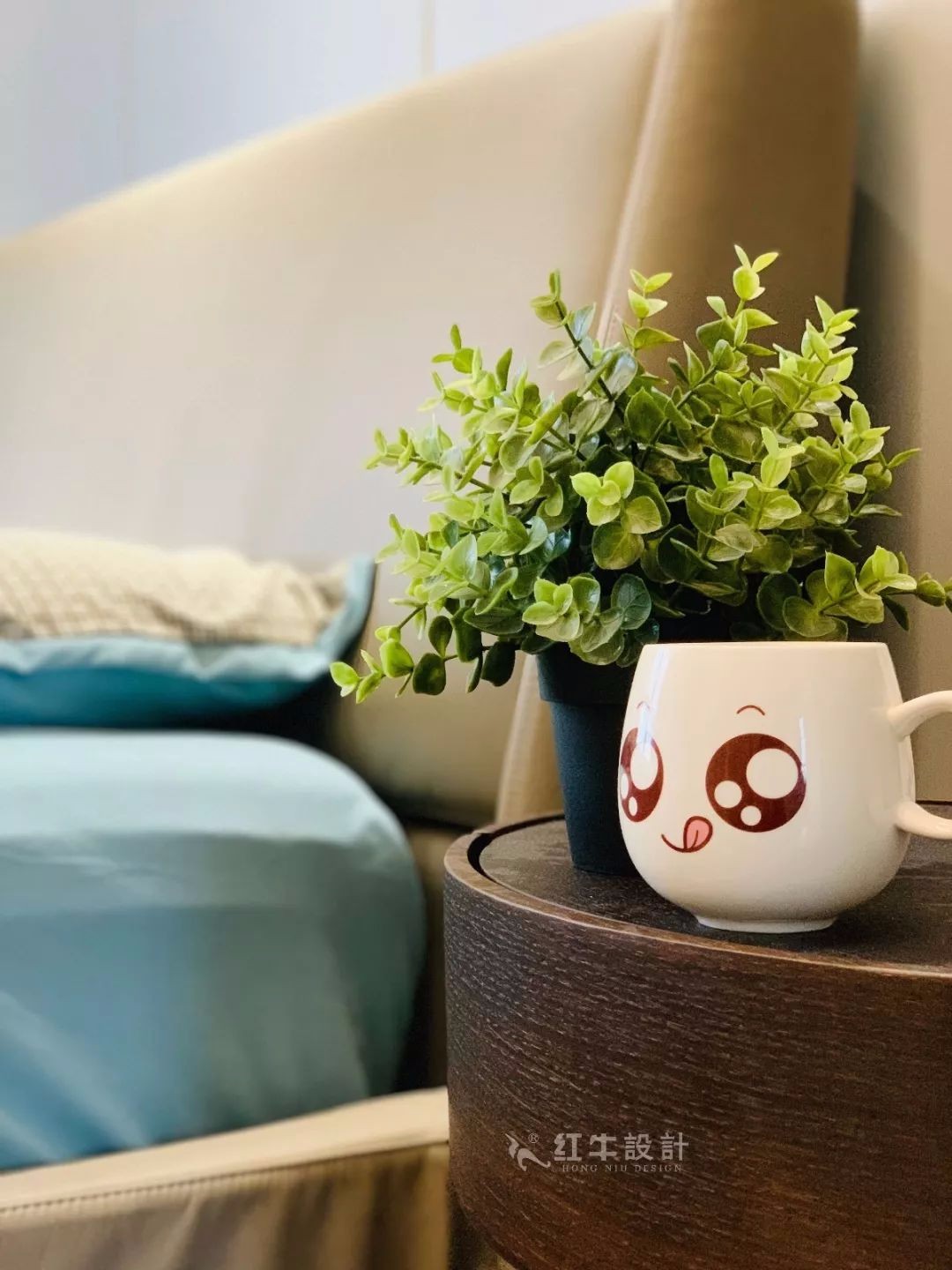 床側(cè)擺放圓形床頭柜,上面放著清新的綠植,帶來清新自然的空間氛圍。